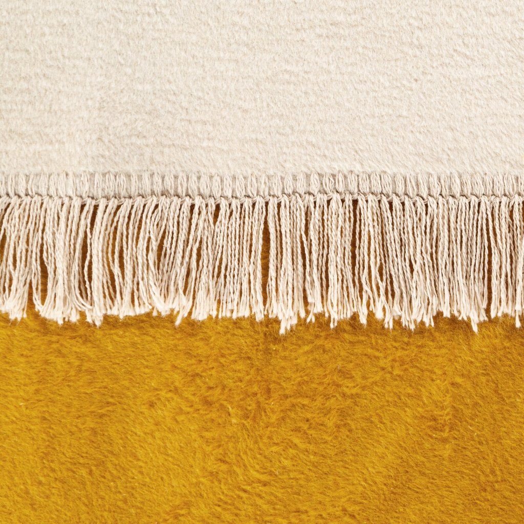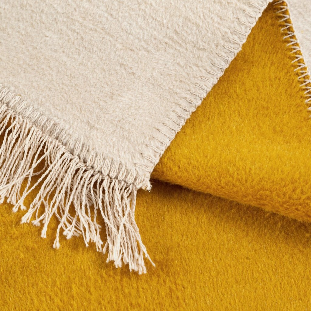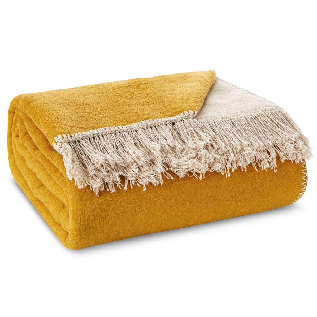Dvoubarevná akrylová deka s třásněmi šířka: 150 cm, délka: 200 cm, barva: žlutá a béžová, hmotnost: 450 GSM, složení: 58 % bavlna, 32 % akryl, 10 % polyester.Doplňkové parametry