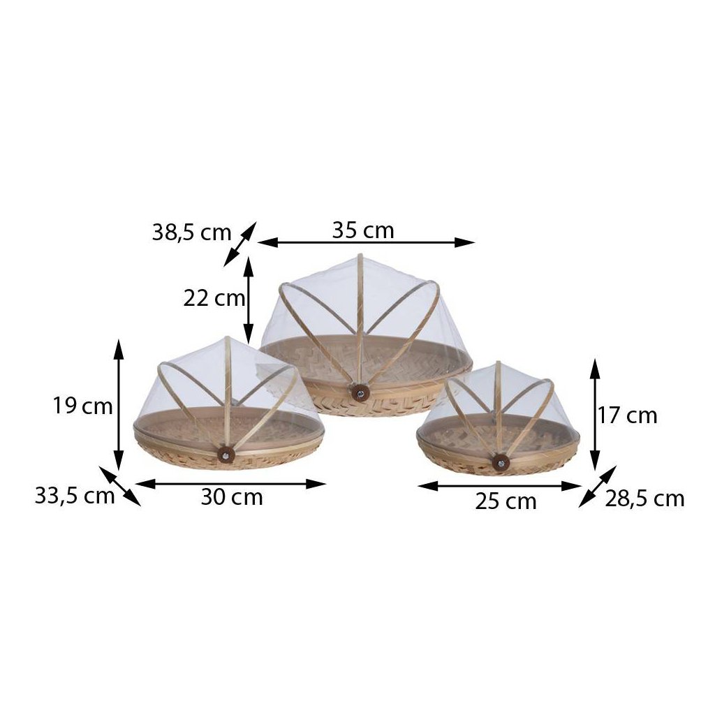 Sada košíků na ovoce Abigail v přírodním vzhledu kombinuje praktickou funkci a dekorativní styl . Každý košík má nízký, pletený tvar a je vybaven skládací ochrannou síťkou , která chrání potraviny před hmyzem – ideální řešení nejen na kuchyňský pult , ale také na piknik či stolování venku .