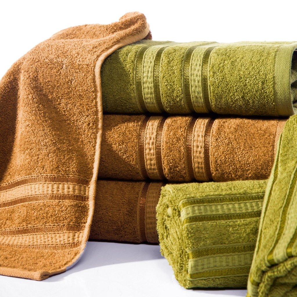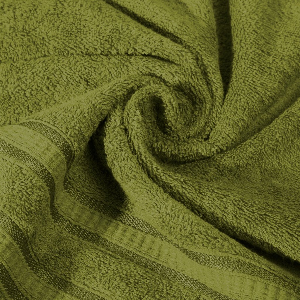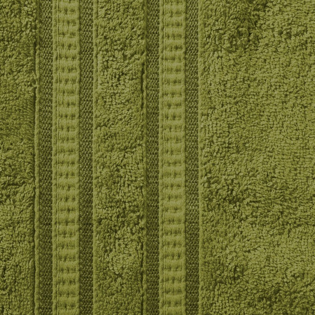 Bambusový ručník s ozdobným pruhovaným okrajem. Šířka: 50 cm, délka: 90 cm, barva: olivová, hmotnost: 500 GSM, složení: 100% viskóza z bambusového vlákna.Doplňkové parametry