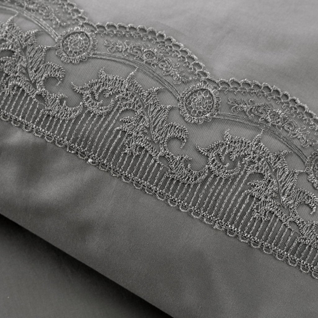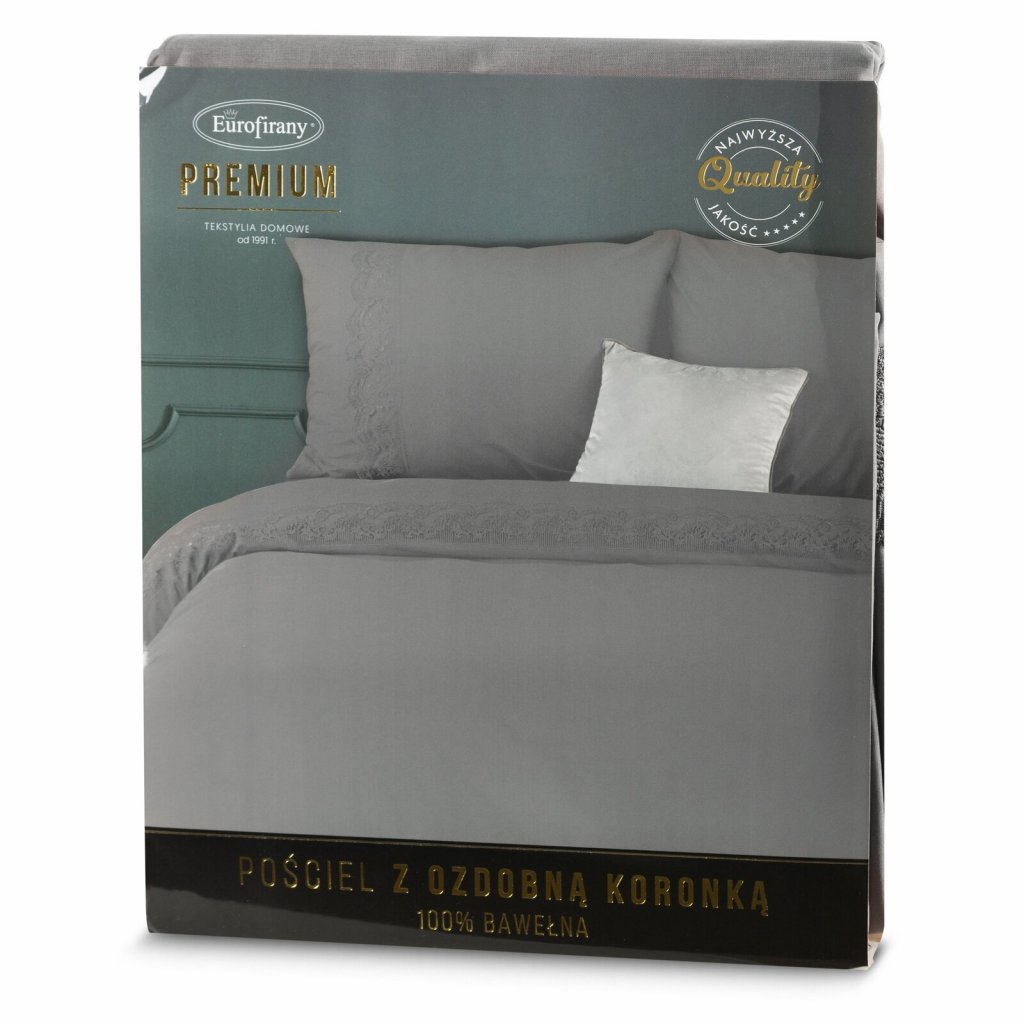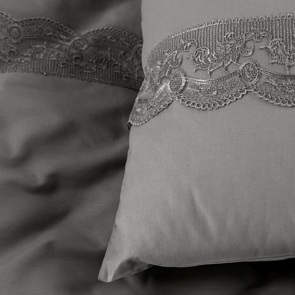 Bavlněné povlečení zdobené krajkou, šířka: 160 cm, délka: 200 cm, povlak na polštář: 2 ks 70x80 cm, barva: tmavě šedá, hmotnost: 115 GSM, složení: 100% bavlna; ozdobná část (krajka): 100% polyester.Doplňkové parametry
