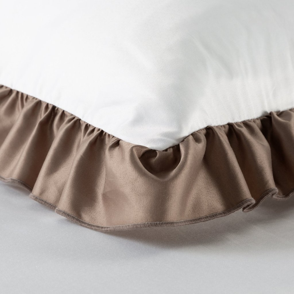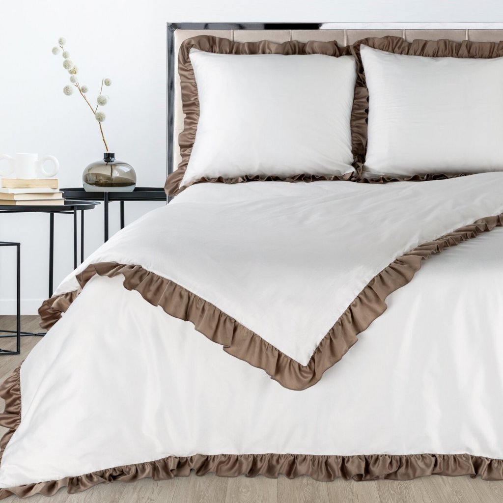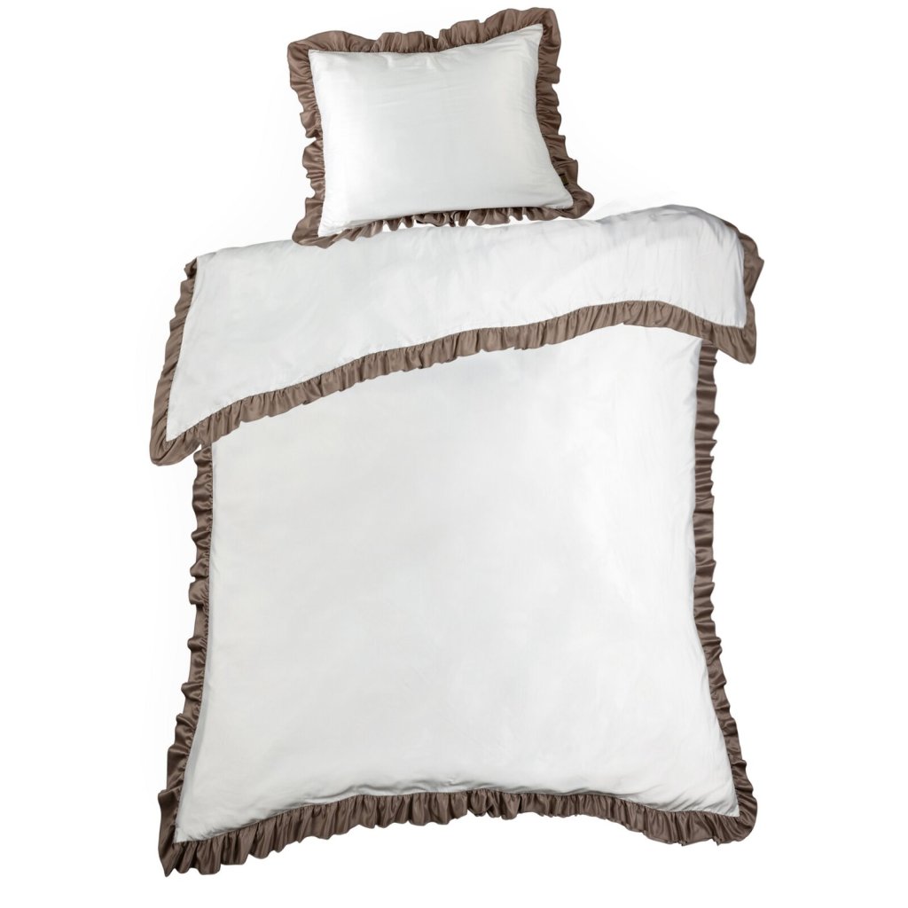 Bavlněná sada povlaků na polštář zdobená volánkovým lemem, šířka: 160 cm, délka: 200 cm, povlak na polštář: 2 ks 70x80 cm, barva: bílá a hnědá, hmotnost: 125 GSM, složení: 55 % bavlna, 45 % polyester.Doplňkové parametry