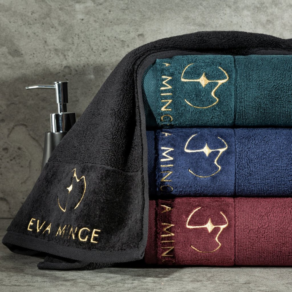 Ručník se sametovým okrajem zdobeným výšivkou, šířka: 30 cm, délka: 50 cm, barva: černá, hmotnost: 550 GSM, složení: 100% bavlna; dekorativní část: 99% bavlna, 1% polyester.Doplňkové parametry
