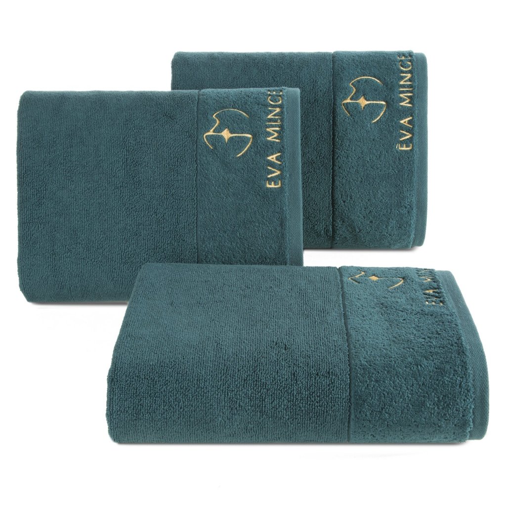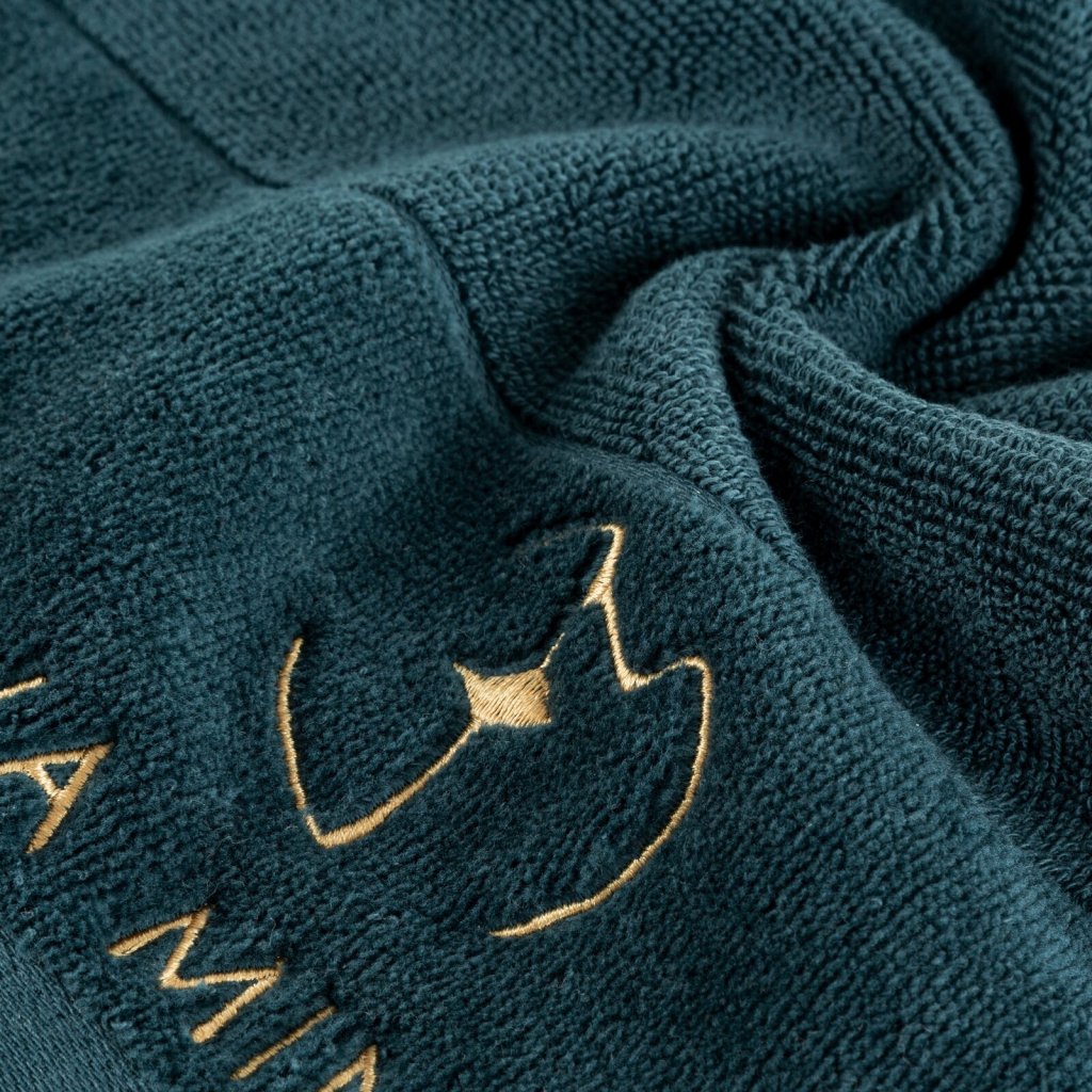 Bavlněný ručník se sametovým okrajem zdobeným výšivkou, šířka: 30 cm, délka: 50 cm, barva: tmavě zelená, hmotnost: 550 GSM, složení: 100% bavlna; ozdobná část: 99% bavlna, 1% polyester.Doplňkové parametry