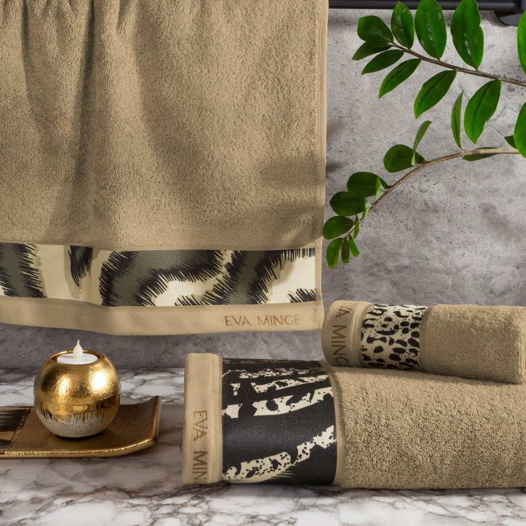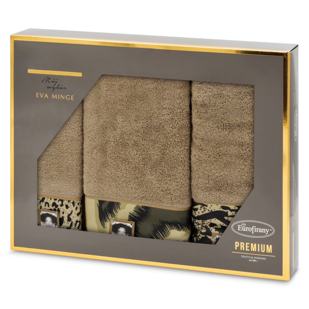 Barevně sladěné ručníky s designovým lemem podtrhnou jedinečný styl vaší koupelny. Mimořádně měkká a nadýchaná bavlna s vysokou gramáží zajišťuje šetrné sušení. Sada tří ručníků z kolekce EVA MINGE, zabalená v elegantní kartonové krabici, je ideálním nápadem na originální a praktický dárek. 3 ks ručníků o rozměrech: 70x140 cm - 1 ks, 50x90 cm - 1 ks, 30x50 cm - 1 ks, barva: béžová, gramáž: 500 GSM, složení: 100% bavlna; dekorativní část: 100% polyester.Doplňkové parametry