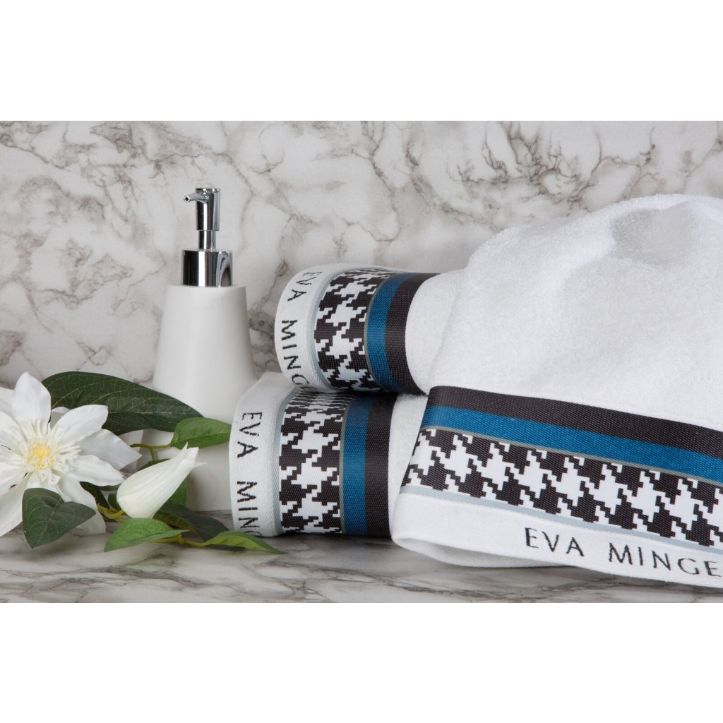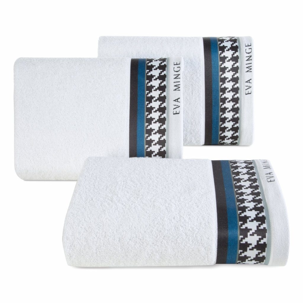 Bavlněné ručníky s žakárovým lemem z kolekce EVA MINGE, šířka: 30 cm, délka: 50 cm, barva: bílá, hmotnost: 485 GSM, složení: 100% bavlna; ozdobná část: 89% bavlna, 11% polyester.Doplňkové parametry