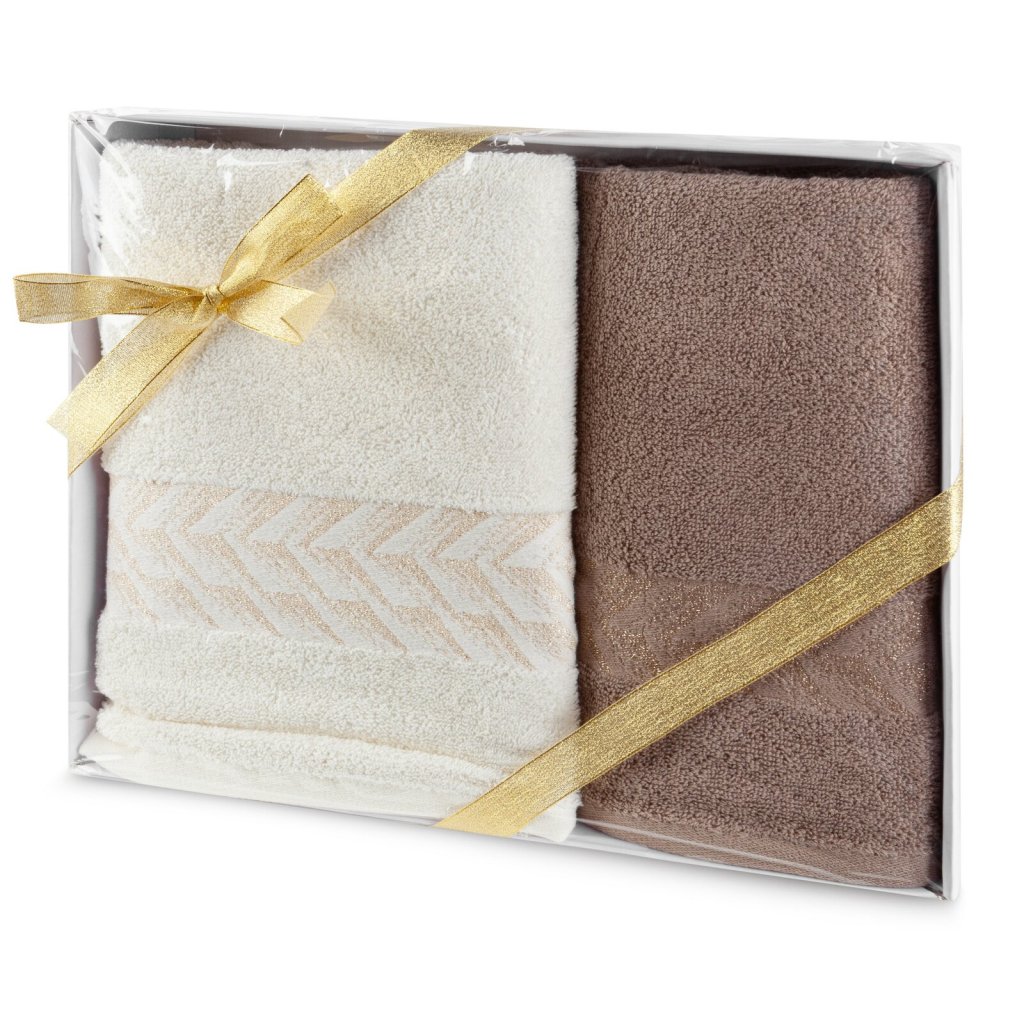 Sada ručníků GLOW je dokonalou kombinací elegance a funkčnosti. Ručníky jsou vyrobeny z vysoce kvalitní, měkké bavlny a jsou mimořádně savé a šetrné k pokožce. Ozdobné lemování s lesklou nití jim dodává jedinečný charakter, takže jsou skvělým dekorativním prvkem v každé koupelně. Sada je zabalena v dárkové krabici, celek je doplněn elegantní mašlí. 2 ks ručníků o rozměrech: 70x140 cm - 1 ks, 50x90 cm - 1 ks, barva: krémová a béžová, gramáž: 450 GSM, složení: 100% bavlna; ozdobná část: 100% polyester.Doplňkové parametry