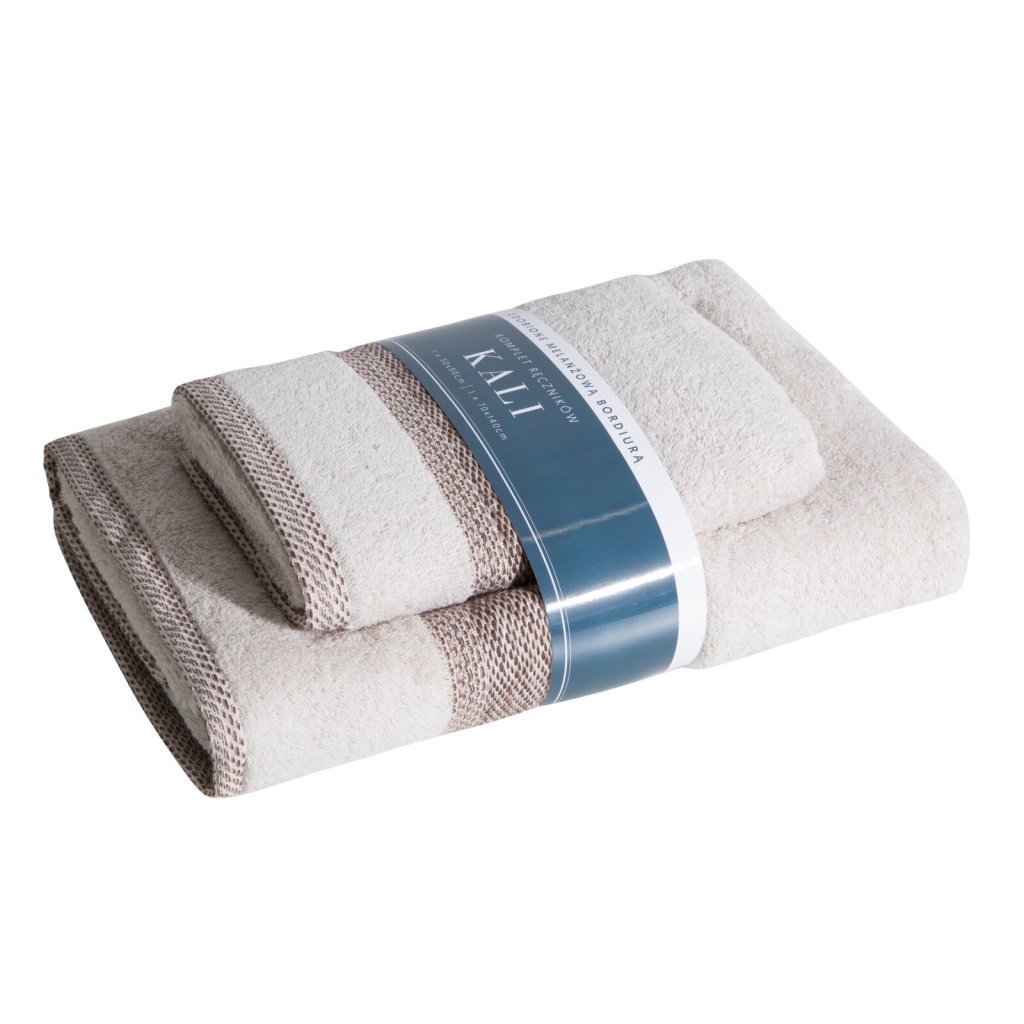 Sada ručníků s ozdobným okrajem. Rozměry: 1 kus 50 x 90 cm, 1 kus 70 x 140 cm, barva: béžová, hmotnost: 500 GSM, složení: 100% bavlna; ozdobná část: 80% polyester, 20% bavlna.Doplňkové parametry