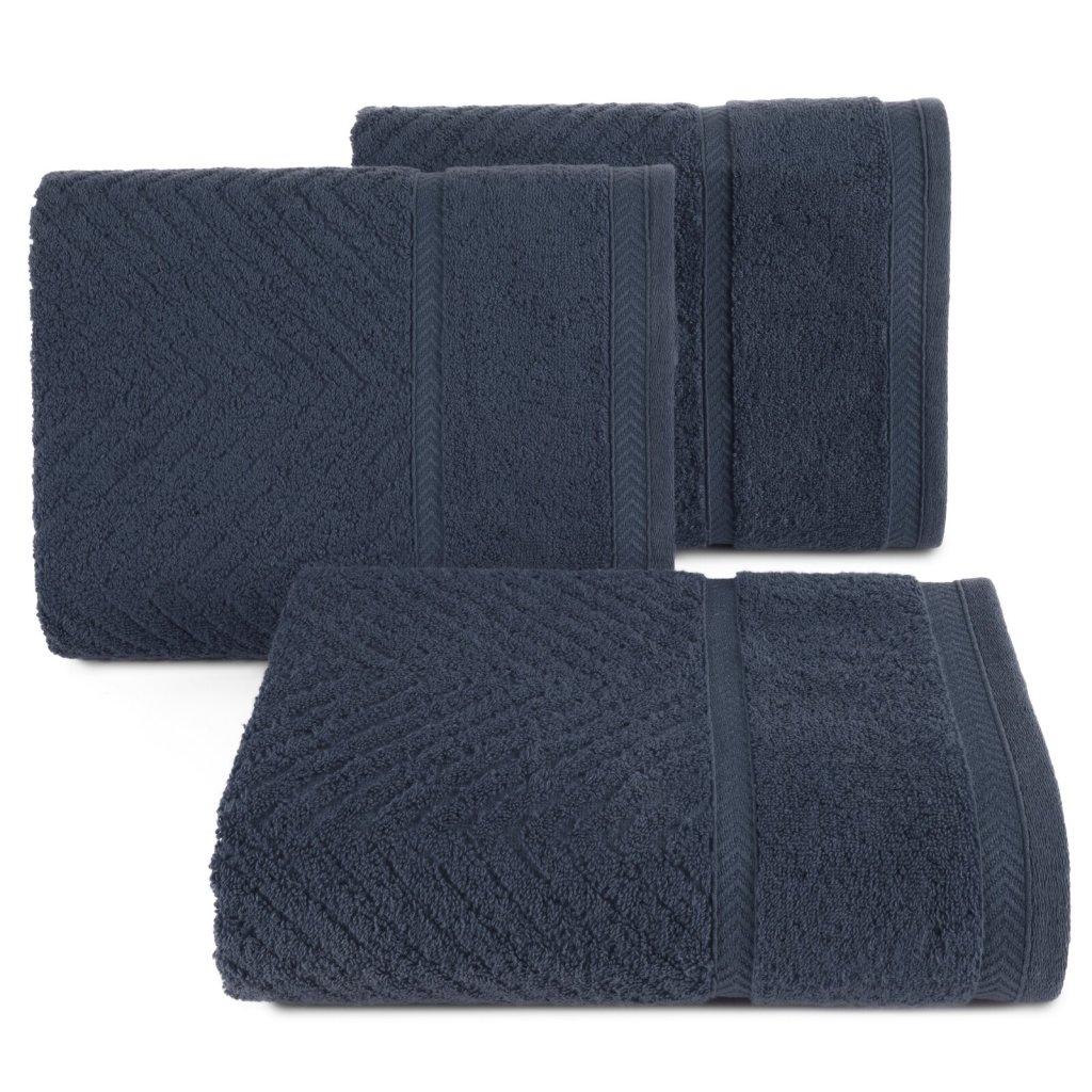 Měkký bavlněný ručník s žakárovým lemem a klikatým vzorem. Šířka: 50 cm, délka: 90 cm, barva: tmavě modrá, hmotnost: 500 GSM, složení: 100 % bavlna.Doplňkové parametry