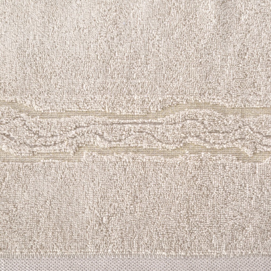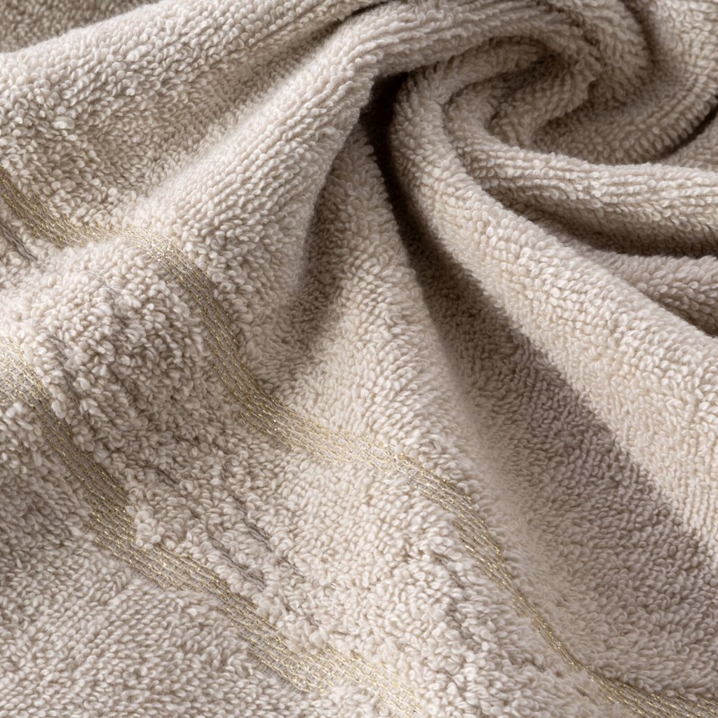 Ručník s ozdobným okrajem a lesklou nití, šířka: 30 cm, délka: 50 cm, barva: béžová, hmotnost: 500 GSM, složení: 100% bavlna; ozdobná část: 50% polyester, 50% viskóza.Doplňkové parametry