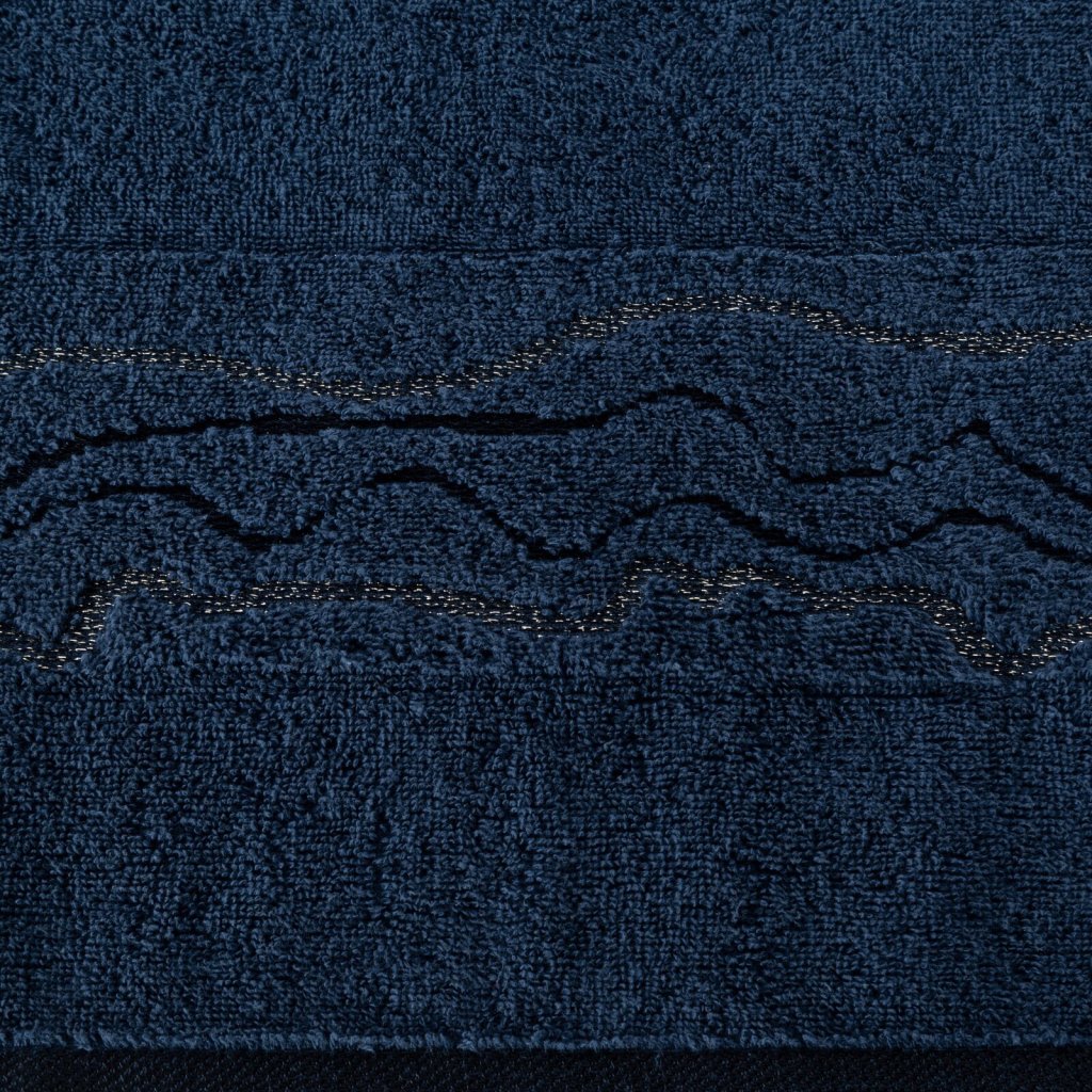 Ručník s ozdobným okrajem a lesklou nití, šířka: 30 cm, délka: 50 cm, barva: tmavě modrá, hmotnost: 500 GSM, složení: 100% bavlna; ozdobná část: 50% polyester, 50% viskóza.Doplňkové parametry