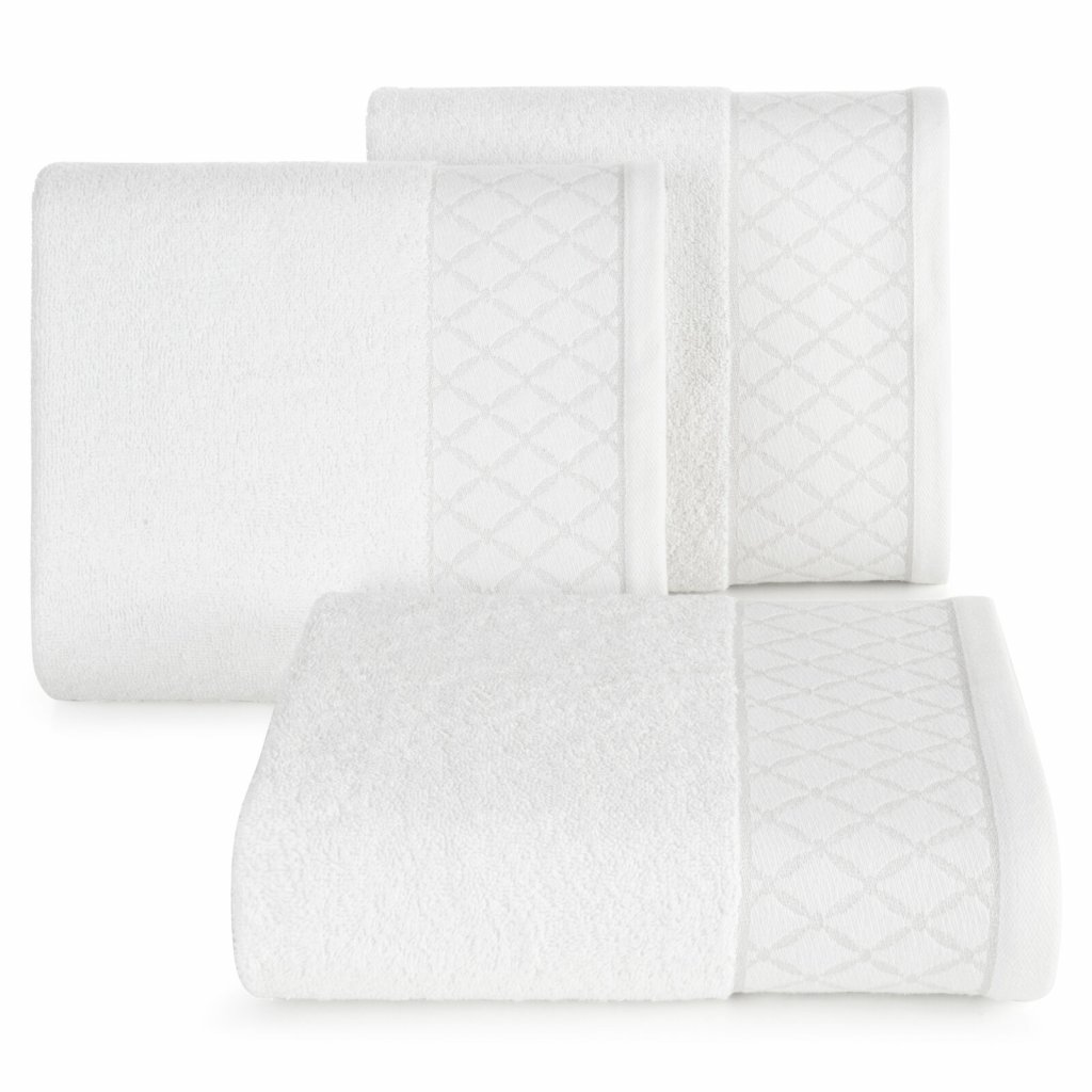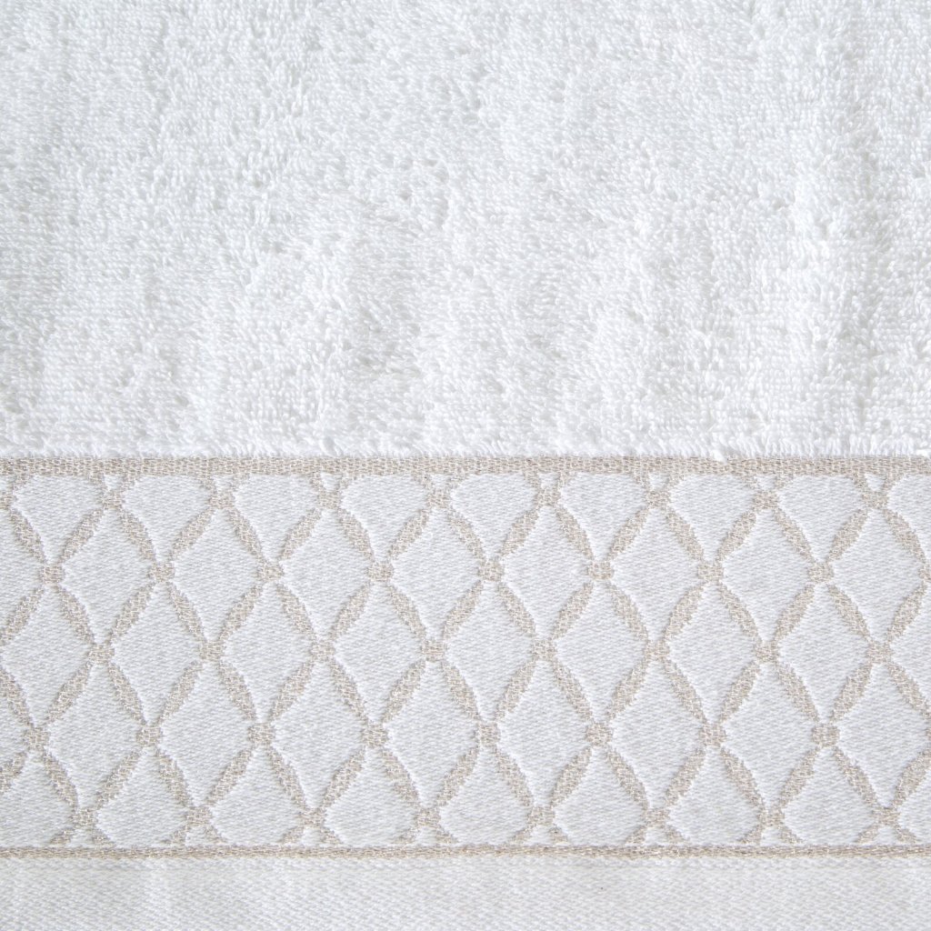 Ručník s ozdobným okrajem a lesklou nití, šířka: 50 cm, délka: 90 cm, barva: bílá, hmotnost: 500 GSM, složení: 100% bavlna; ozdobná část: 50% bavlna, 50% polyester.Doplňkové parametry