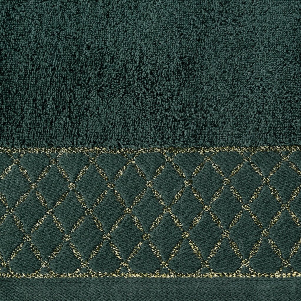 Ručník s ozdobným okrajem a lesklou nití, šířka: 50 cm, délka: 90 cm, barva: tmavě zelená, hmotnost: 500 GSM, složení: 100% bavlna; ozdobná část: 50% bavlna, 50% polyester.Doplňkové parametry