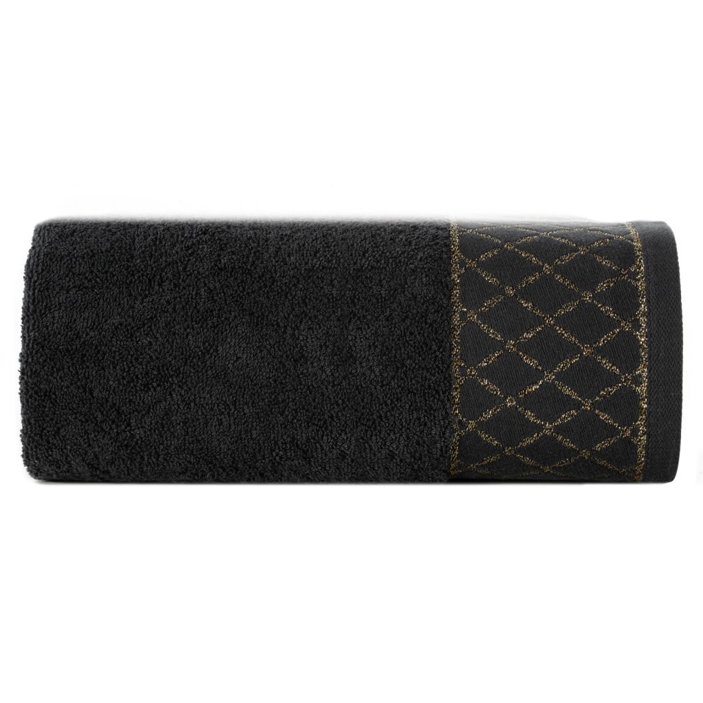 Ručník s ozdobným okrajem a lesklou nití, šířka: 70 cm, délka: 140 cm, barva: černá, hmotnost: 500 GSM, složení: 100% bavlna; ozdobná část: 50% bavlna, 50% polyester.Doplňkové parametry