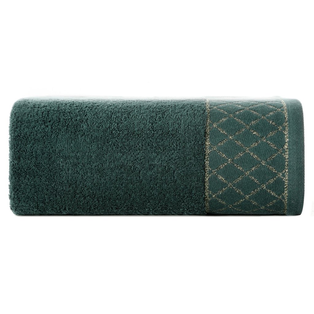 Ručník s ozdobným okrajem a lesklou nití, šířka: 70 cm, délka: 140 cm, barva: tmavě zelená, hmotnost: 500 GSM, složení: 100% bavlna; ozdobná část: 50% bavlna, 50% polyester.Doplňkové parametry