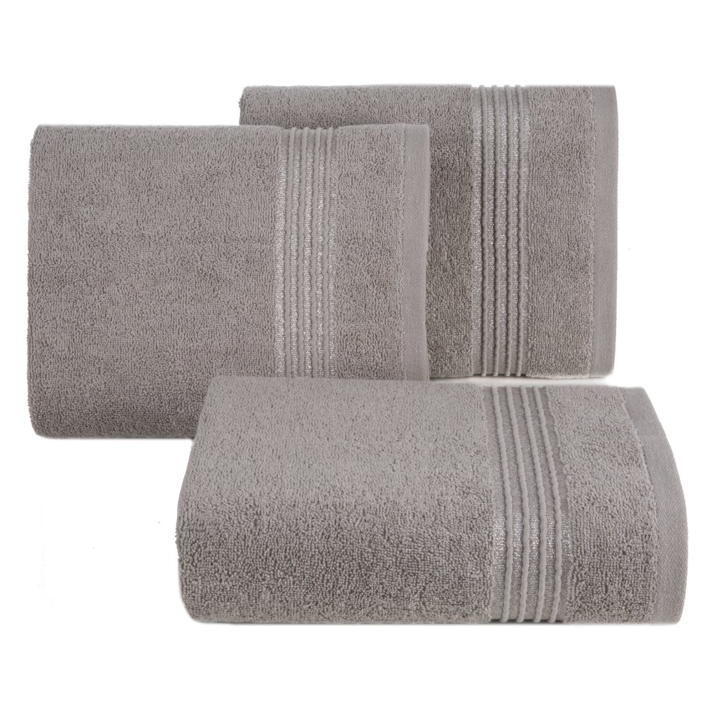 Ručník s ozdobným okrajem a lesklou nití, šířka: 30 cm, délka: 50 cm, barva: šedá, hmotnost: 500 GSM, složení: 100% bavlna; ozdobná část: 50% bavlna, 50% polyester.Doplňkové parametry