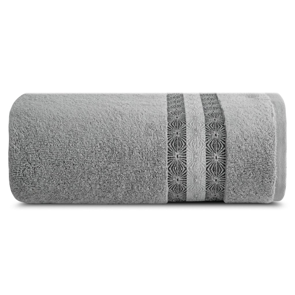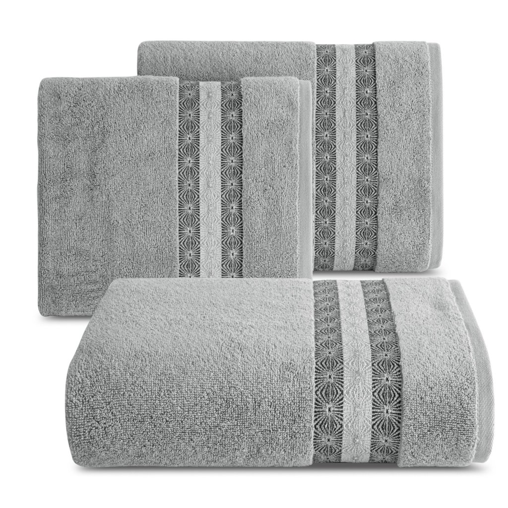 Ručník, šířka: 70 cm, délka: 140 cm, barva: světle šedá, hmotnost: 500 GSM, složení: 100% bavlna; dekorativní část: 61% bavlna, 20% polyester, 19% kovová nit.Doplňkové parametry