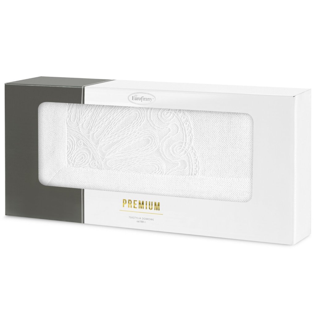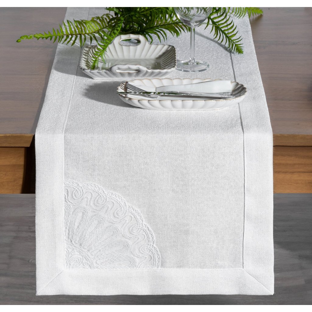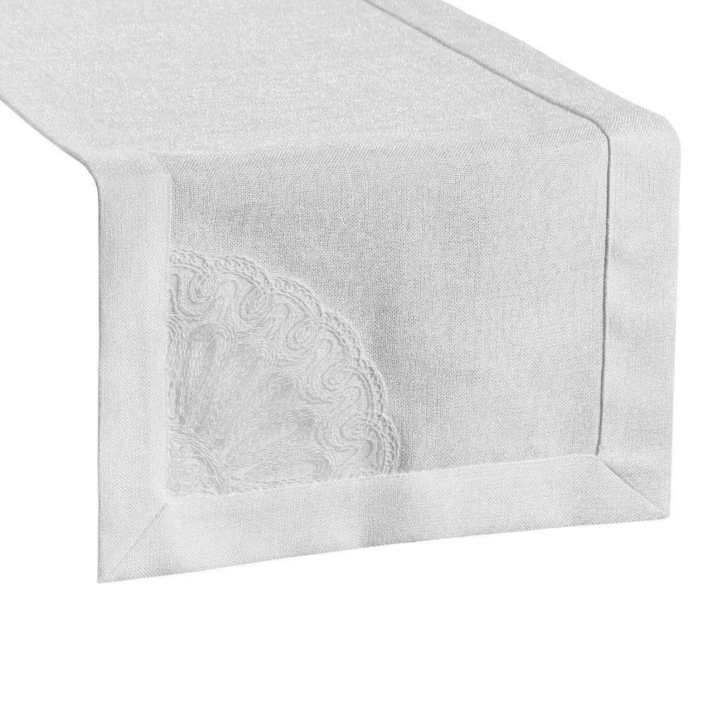 Exkluzivní dekorační ubrus s jemným dekorem, šířka: 40 cm, délka: 140 cm, barva: bílá, hmotnost: 280 GSM, složení: 100% polyester.Doplňkové parametry