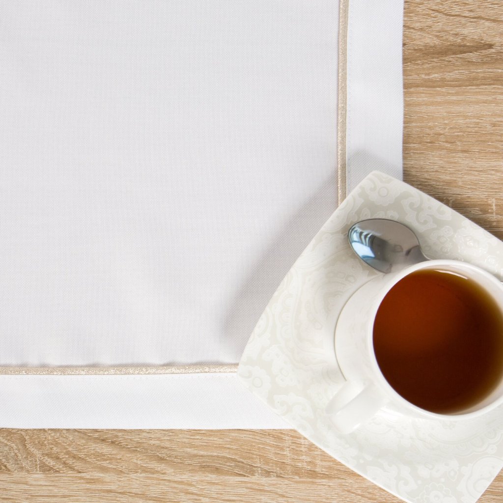 Běhoun na stůl s jemným zlatým lemováním, baleno v elegantní krabičce, šířka: 40 cm, délka: 180 cm, barva: bílá/zlatá, hmotnost: 190 GSM, složení: 100% polyester.Doplňkové parametry