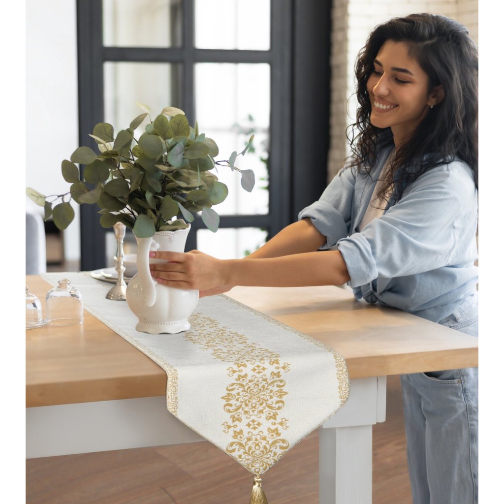Běhoun na stůl MAJORKA, vyrobený z vysoce kvalitní látky, kombinující eleganci s krásnými detaily. Jeho povrch zdobí jemný vzor, pečlivě vyšitý třpytivou nití. Okraje ubrusu jsou pečlivě zdobeny zlatou metalickou nití, která celému kusu dodává rafinovaný, třpytivý vzhled. Dalším akcentem jsou střapce na koncích ubrusu. Šířka: 30 cm, délka: 180 cm, barva: vícebarevná, hmotnost: 500 GSM, složení: 75 % polyester, 24 % viskóza, 1 % metalická nit.Doplňkové parametry