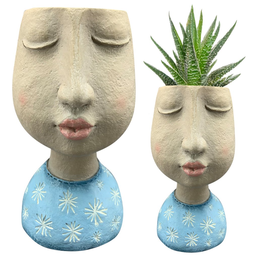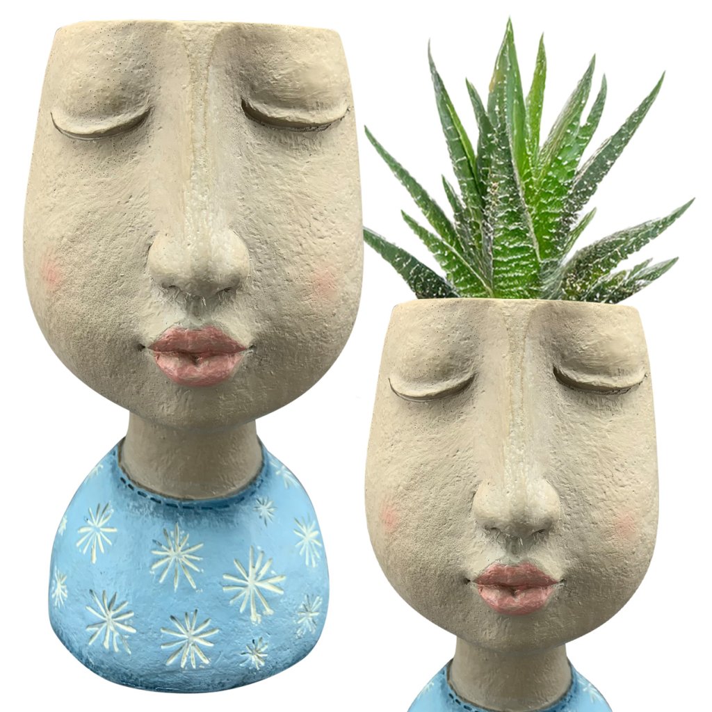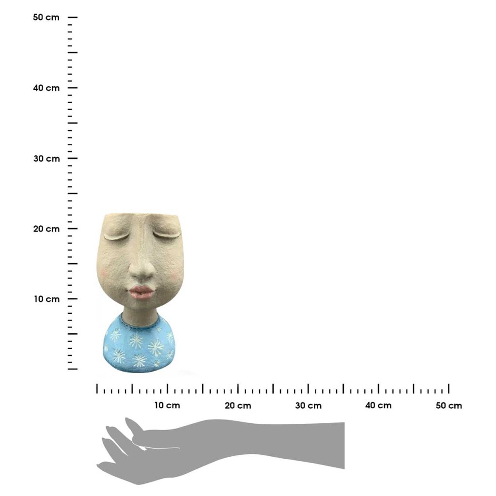 Betonový květináč Landon zaujme svým originálním designem v podobě ženského obličeje se zavřenýma očima a jemným uměleckým výrazem. Květináč o rozměrech 11,8 × 21 cm je vyroben z odolné pryskyřice polyresin a ručně malován pastelovými barvami, které mu dodávají osobitý šarm. Nápadité provedení s modrými šaty a jemně působícími detaily jej předurčuje k umístění na parapet, komodu nebo polici, kde se stane estetickým doplňkem interiéru . Stabilní konstrukce umožňuje použití na drobné pokojové rostliny, bylinky nebo sukulenty. Dekorativní květináč v uměleckém stylu výborně zapadne do zařízení s nádechem vintage, skandinávského nebo boho designu a vynikne i samostatně jako elegantní detail.Doplňkové parametry