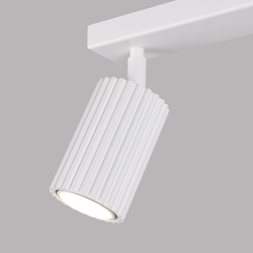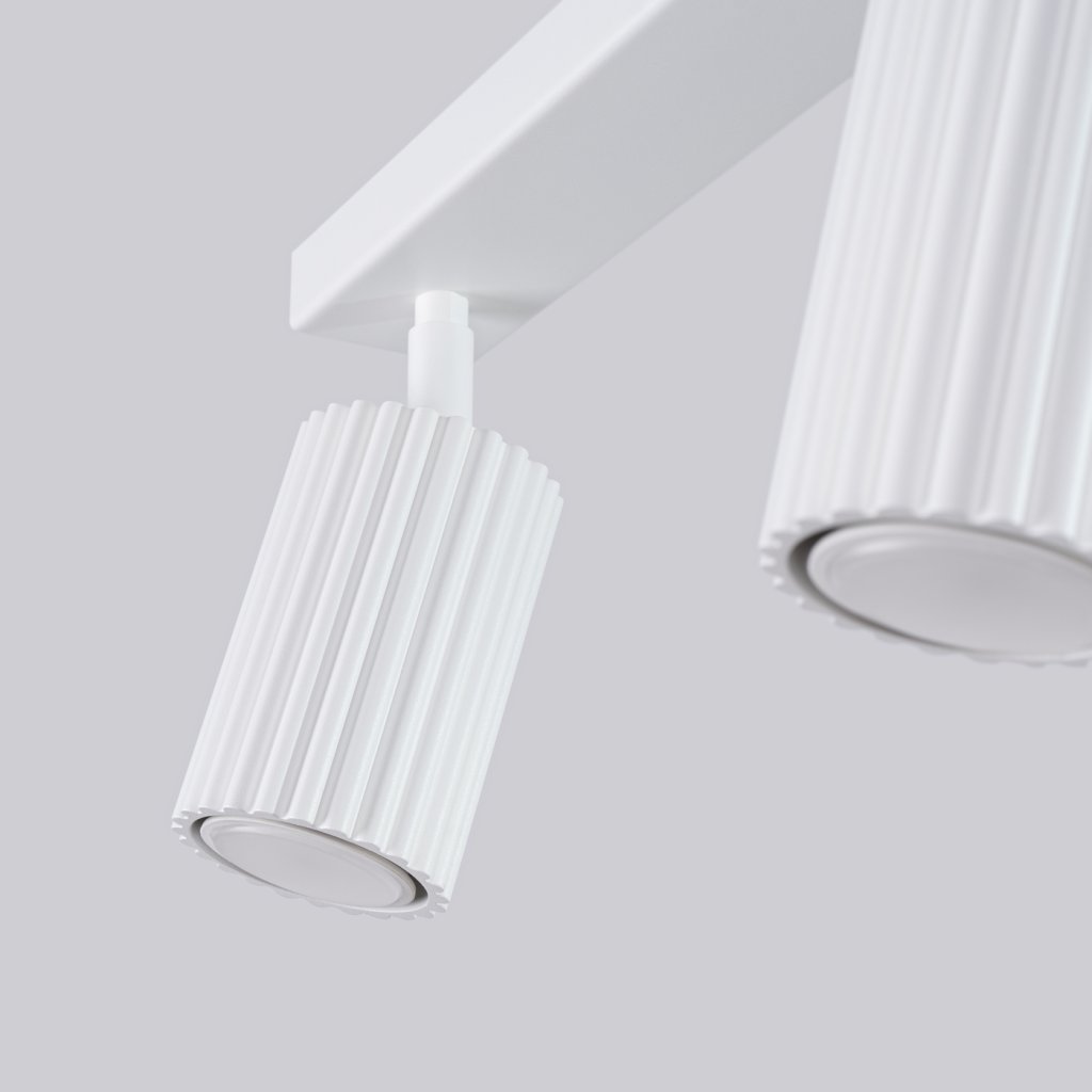Díky kvalitní kovové konstrukci a matnému bílému provedení je svítidlo odolné, snadno se udržuje a zároveň vypadá elegantně. Žebrovaný povrch stínidel dodává jemný dekorativní akcent, který umocňuje moderní charakter prostoru.
