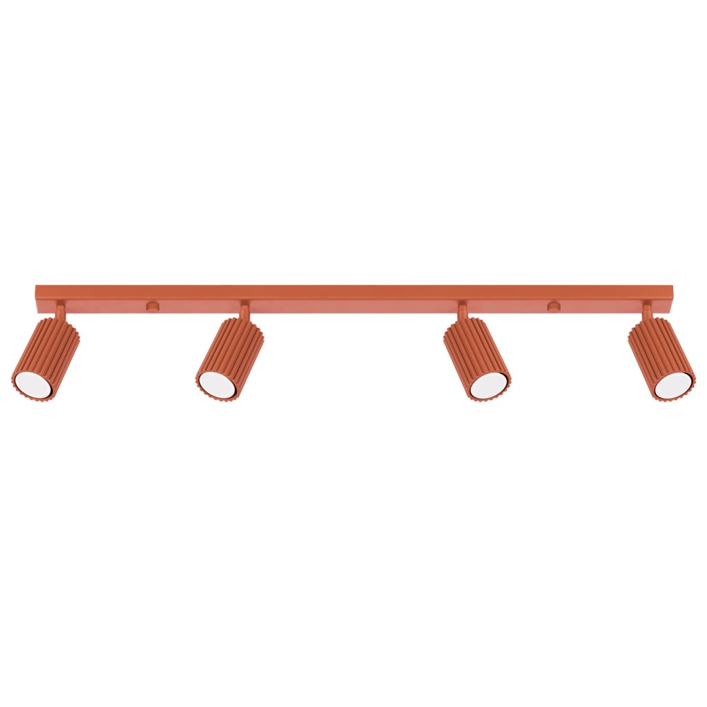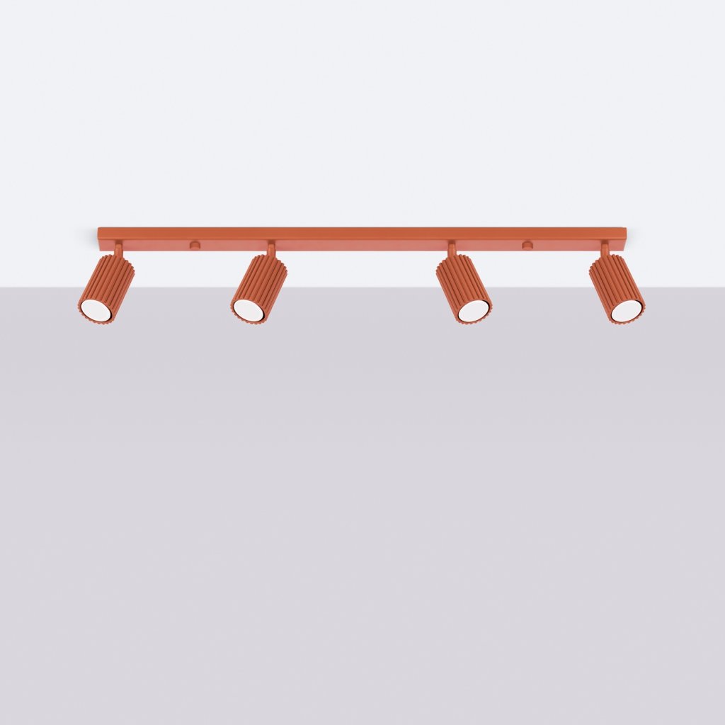 Bodové svítidlo KARBON se čtyřmi okrově červenými kovovými stínidly je moderní a funkční řešení osvětlení, které v sobě spojuje eleganci, praktičnost a originální design. Jeho charakteristický žebrovaný povrch dodává svítidlu industriální nádech, takže se skvěle hodí do moderních i loftových interiérů. Jeho minimalistická forma a výrazné barevné provedení z něj dělají zajímavý prvek, který rozzáří každý prostor.