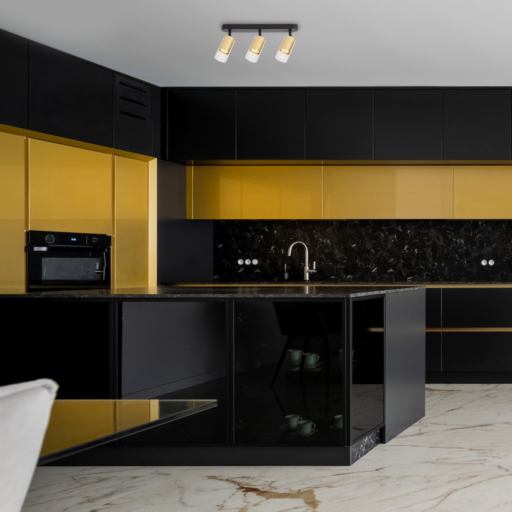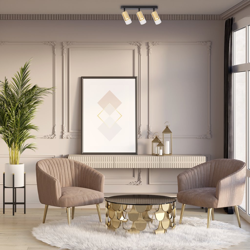 Tělo svítidla je vyhotoveno ve zlaté barvě a doplněno o transparentní plastová stínítka , která rovnoměrně rozptylují světlo. Tři světelné hlavice umožňují nastavení směru svícení dle aktuálních potřeb, což oceníte například při osvětlení obývacího pokoje, kuchyňské linky či pracovního koutku.