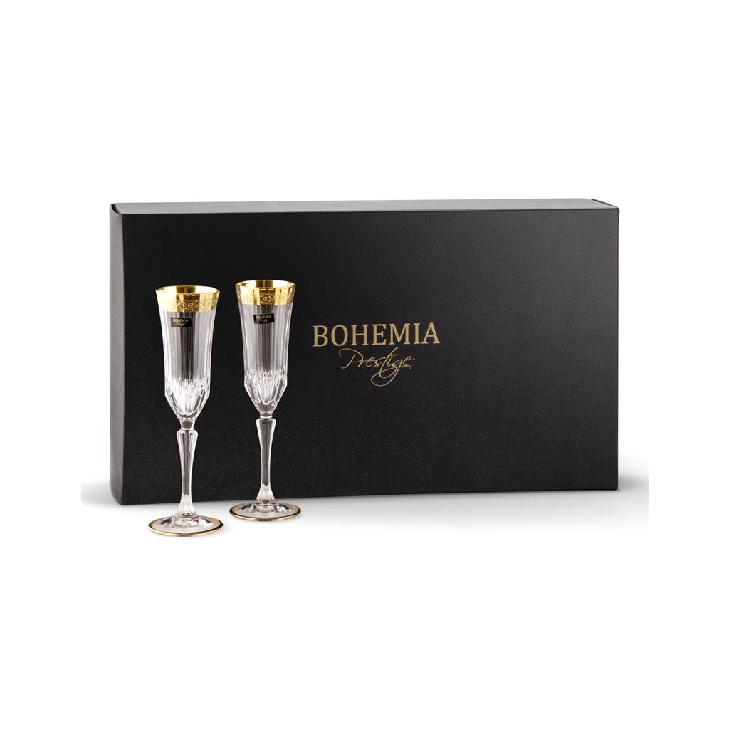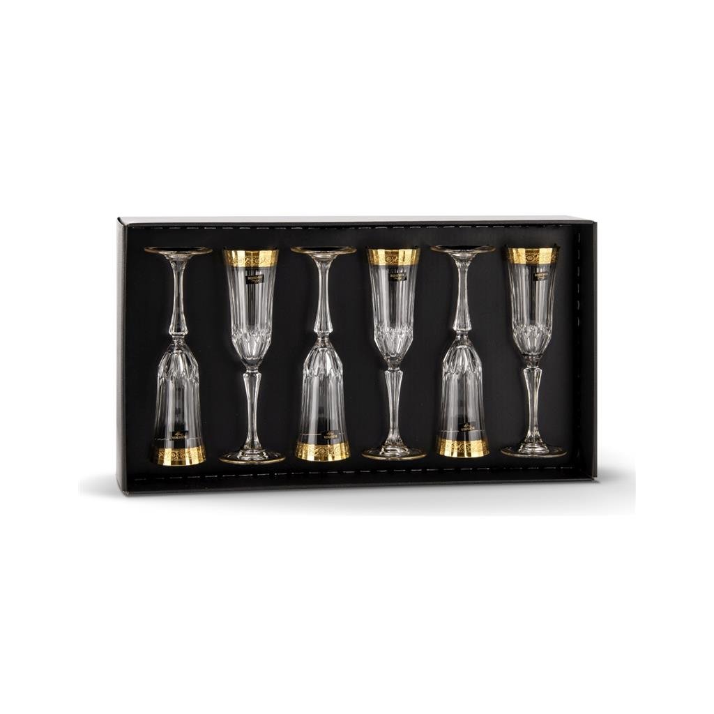 Bohemia Prestige MIRADOR šampaňské set 6 je určen pro skutečné fajnšmekry. Tato unikátní sada je balena v exkluzivním černém balení se zlatým logem Bohemia Prestige a je ideální jako dárek pro každou příležitost.Samotné sklenice jsou vyrobeny z křišťálového skla nejvyšší kvality. Sklo je průhledné, odolné a má svůj originální design se zlatým zdobením ať už na stole nebo na baru působí luxusně a svou výjimečností neunikne očím žádné návštěvy.