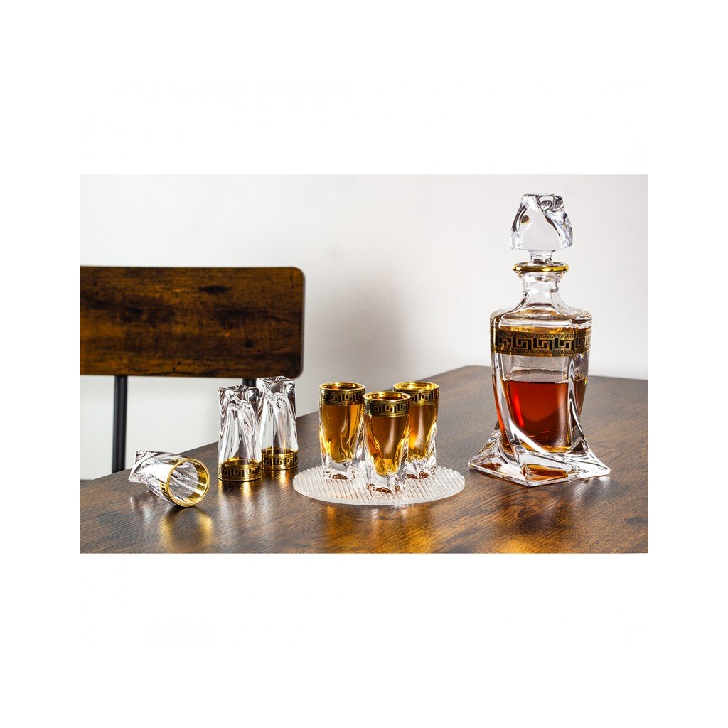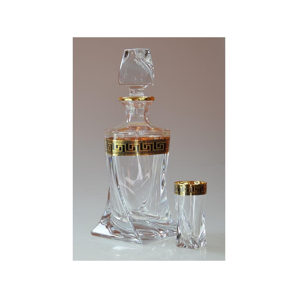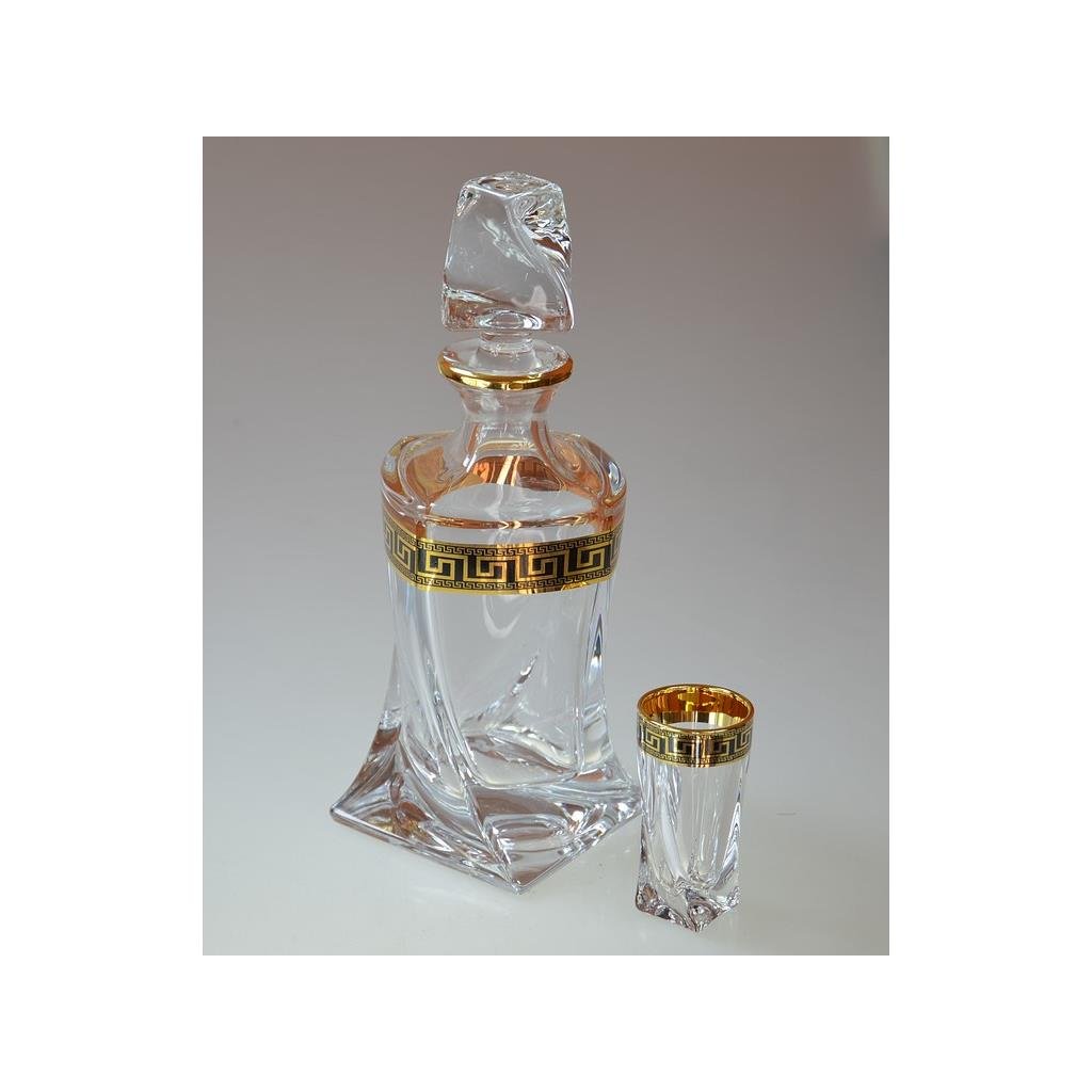 Křišťálová souprava na likér Quadro Verso Gold obsahuje stylovou karafu o objemu 500 ml a šest zdobených skleniček o objemu 50 ml . Celá souprava je vyrobena z křišťálového skla nejvyšší kvality a zdobená elegantním černo-zlatým dekorem , který jí dodává výjimečný charakter. Svým precizním zpracováním a sofistikovaným vzhledem představuje skvělý dárek i vkusný doplněk každého interiéru. Výrobky nejsou vhodné pro mytí v myčce nádobí.