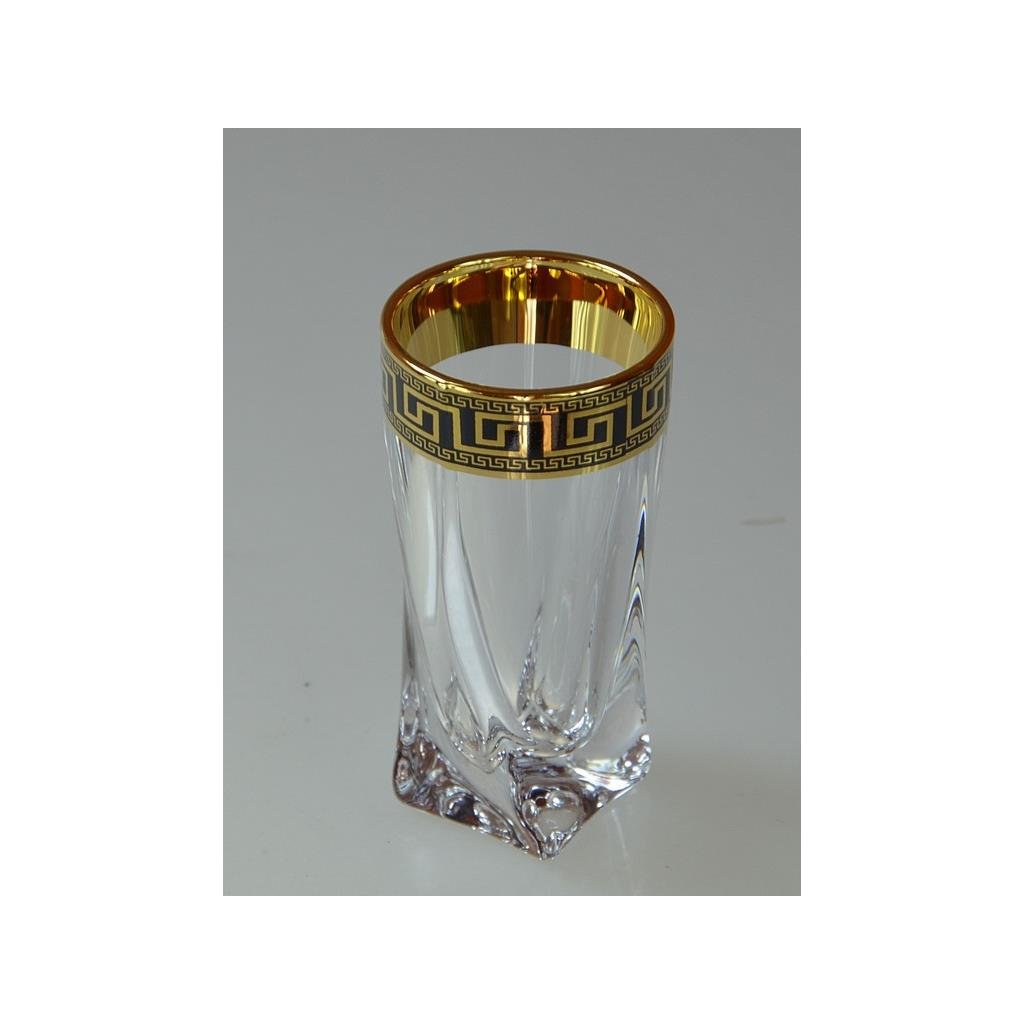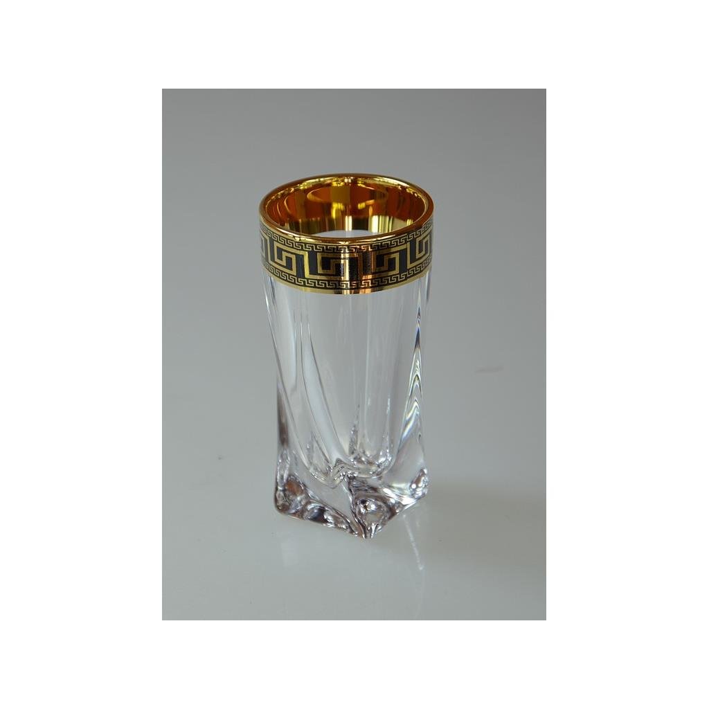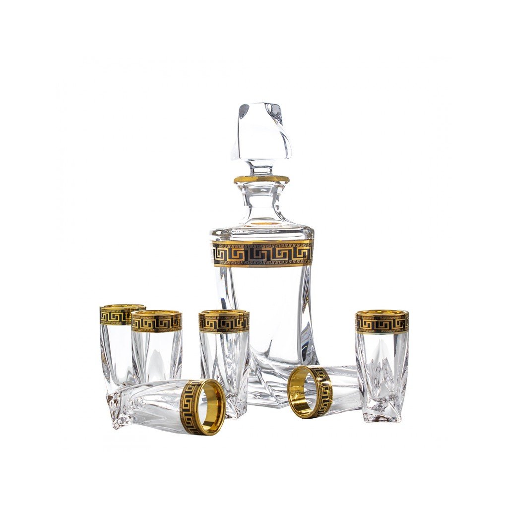 Křišťálová souprava na likér Quadro Verso Gold obsahuje stylovou karafu o objemu 500 ml a šest zdobených skleniček o objemu 50 ml . Celá souprava je vyrobena z křišťálového skla nejvyšší kvality a zdobená elegantním černo-zlatým dekorem , který jí dodává výjimečný charakter. Svým precizním zpracováním a sofistikovaným vzhledem představuje skvělý dárek i vkusný doplněk každého interiéru. Výrobky nejsou vhodné pro mytí v myčce nádobí.