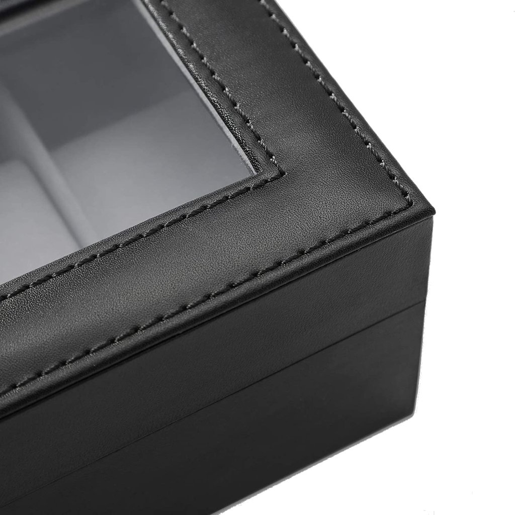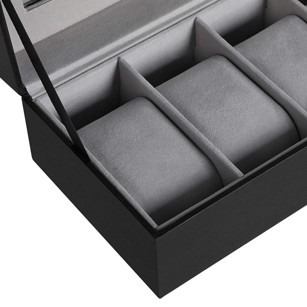Víko ze skla zajišťuje přehled o uložených hodinkách bez potřeby otevírání , což výrazně zjednodušuje výběr vhodného modelu k outfitu. Vnitřní prostor je vystlaný jemným sametem a každá přihrádka obsahuje samostatnou podušku , která hodinky chrání před prachem, poškrábáním a mechanickým poškozením.