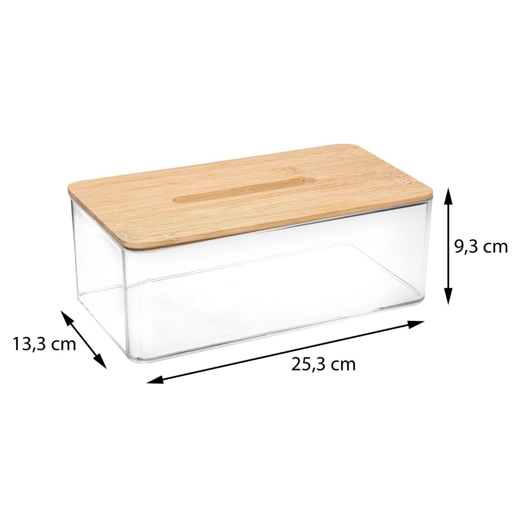 Praktický box na papírové kapesníky, který dobře poslouží v každé místnosti. Optimální rozměry umožňují uskladnit velké množství kapesníků, takže se nemusíte obávat častého doplňování. Stylová kombinace čirého plastu a bambusu mu dodává přirozený vzhled, díky čemuž je doplňkovým dekorativním prvkem. Box má pohodlné otevírání a vyříznutý otvor, přes který můžete ubrousky volně vytáhnout bez rizika jejich roztržení.Doplňkové parametry