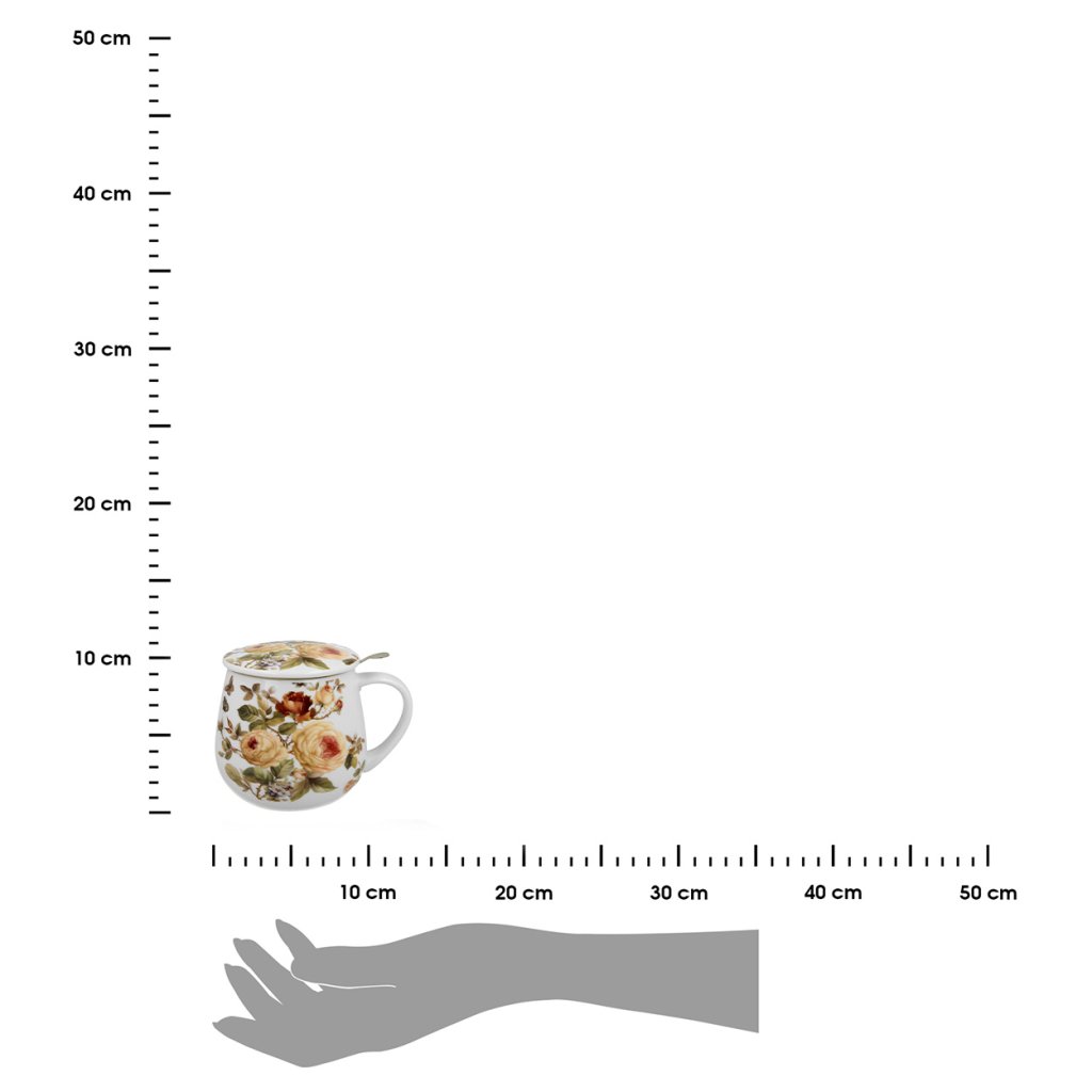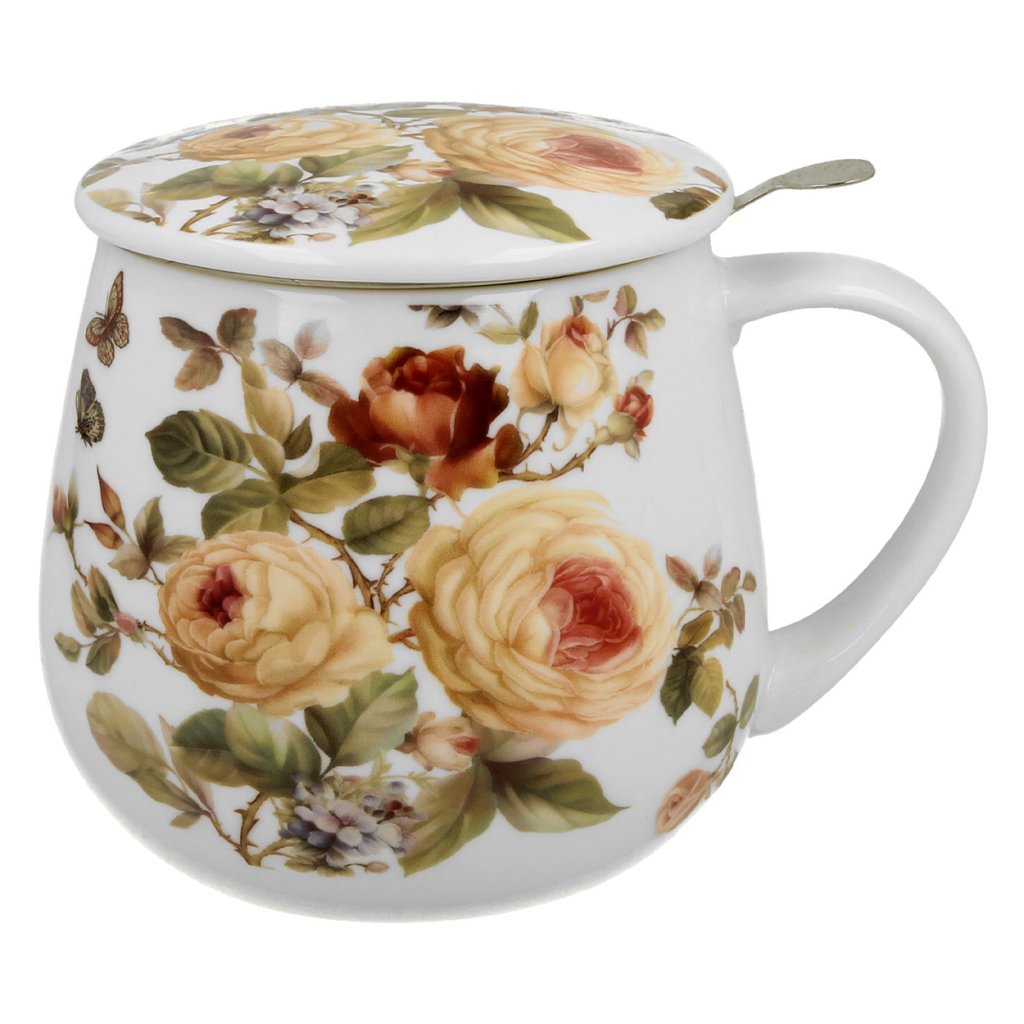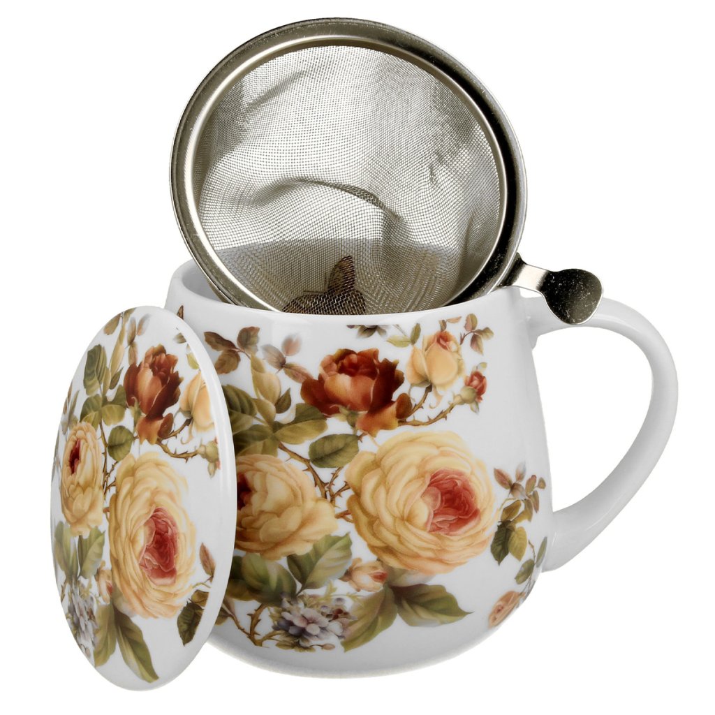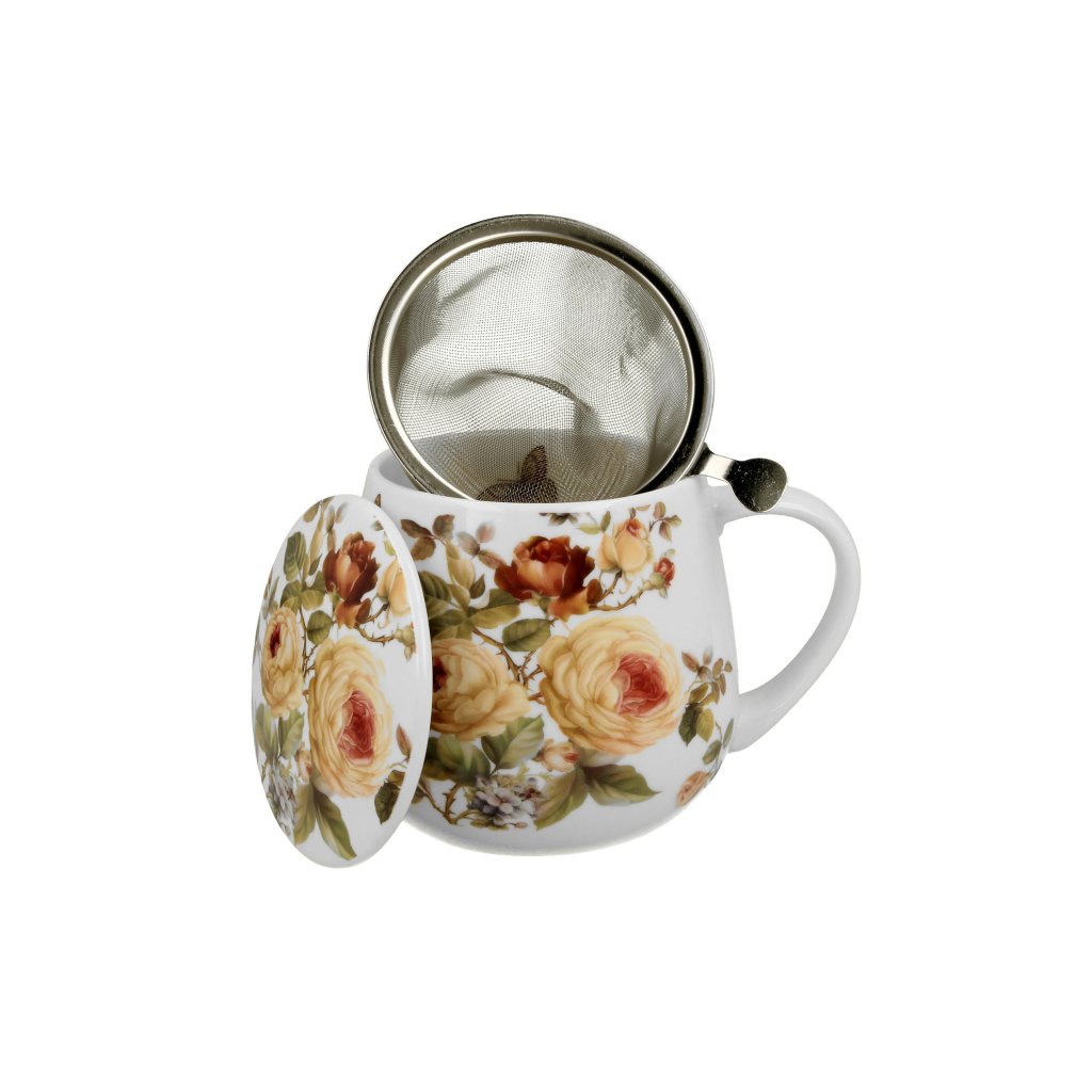 Součástí čajové soupravy je porcelánový hrnek o objemu 430 ml , praktické porcelánové víčko a kovové sítko pro pohodlné louhování sypaného nebo bylinkového čaje. Tvar hrníčku se příjemně drží v ruce a umožňuje komfortní vychutnávání oblíbeného nápoje během dne.