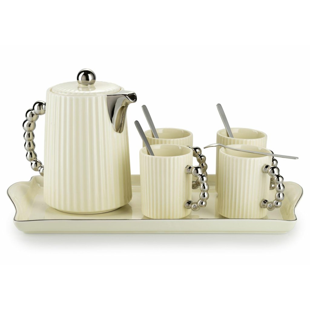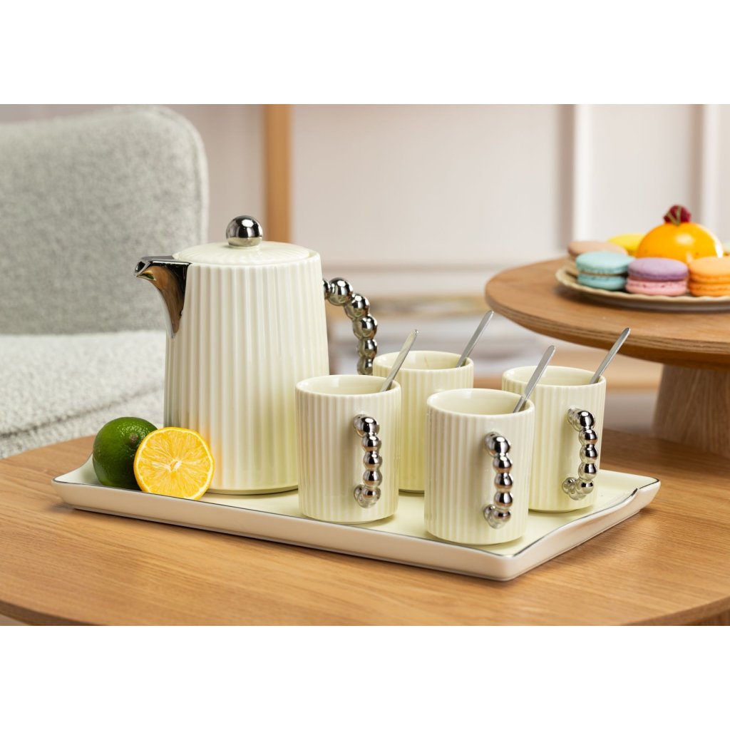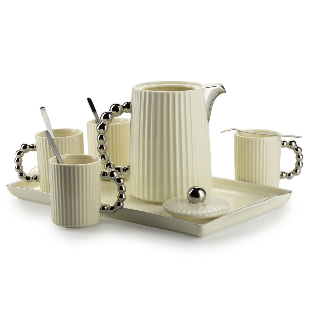 Stylová čajová/kávová souprava Luca Silver Cream. Set obsahuje hrníčky, džbán, čtyři zlaté lžičky a podnos. Charakteristická ouška sklenic v podobě kuliček upoutají pozornost a dodají celku moderní charakter. Originálně tvarovaný džbán zajišťuje snadné nalévání nápoje a prostorný tác usnadňuje podávání. Souprava Luca Silver Cream je ideální volbou pro schůzky, ale také pro každodenní použití. Krémová barva s jemnými chromovými akcenty se hodí do každého interiéru a jedinečný vzhled jistě upoutá pozornost.Doplňkové parametry