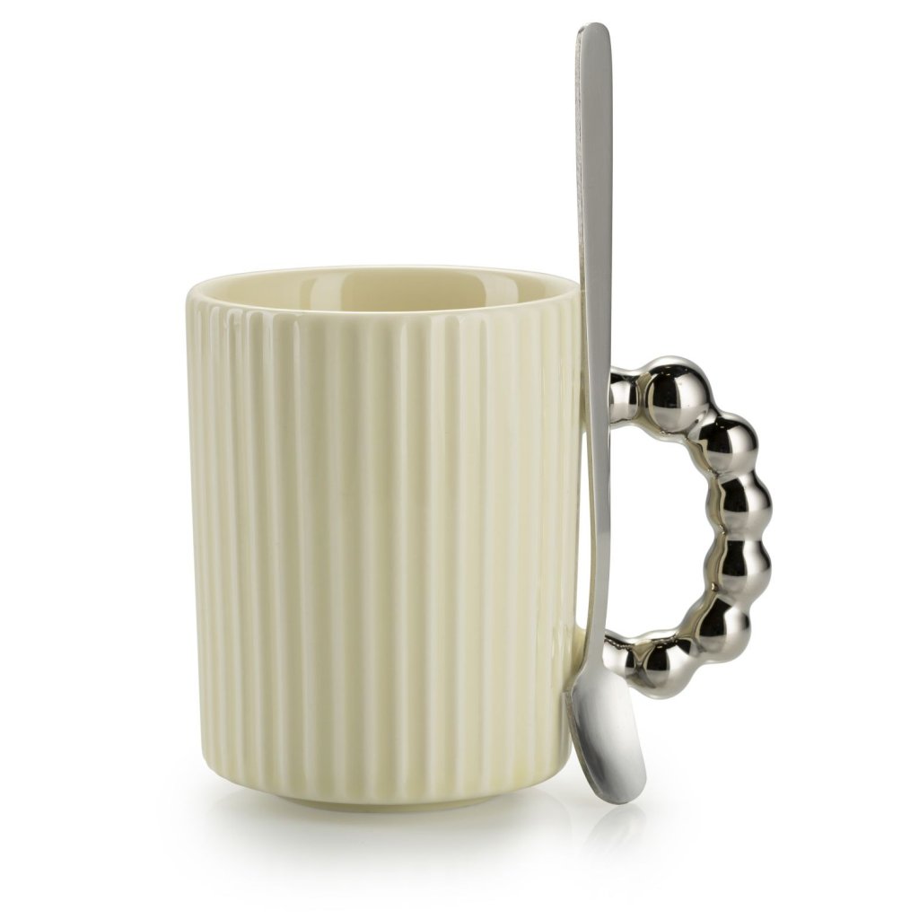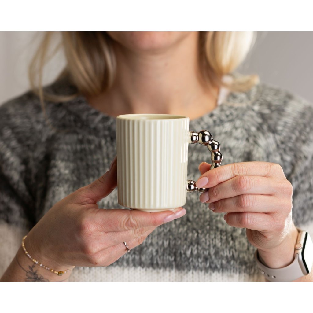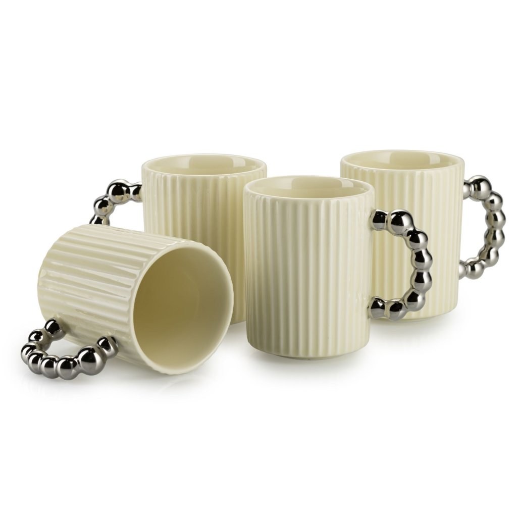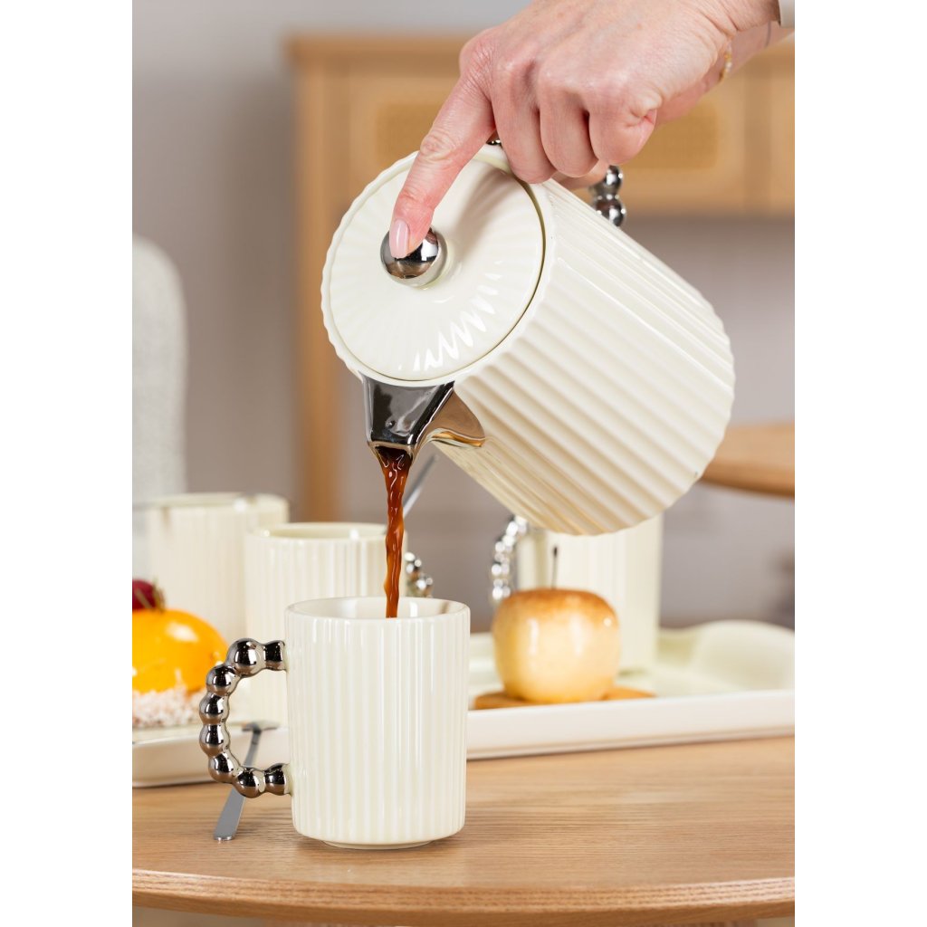 Stylová čajová/kávová souprava Luca Silver Cream. Set obsahuje hrníčky, džbán, čtyři zlaté lžičky a podnos. Charakteristická ouška sklenic v podobě kuliček upoutají pozornost a dodají celku moderní charakter. Originálně tvarovaný džbán zajišťuje snadné nalévání nápoje a prostorný tác usnadňuje podávání. Souprava Luca Silver Cream je ideální volbou pro schůzky, ale také pro každodenní použití. Krémová barva s jemnými chromovými akcenty se hodí do každého interiéru a jedinečný vzhled jistě upoutá pozornost.Doplňkové parametry