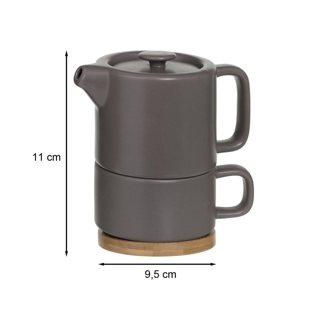 Čaj uvařený v krásné a stylové konvici činí jeho pití ještě příjemnějším! Set sestávající z konvice a šálku působí originálně a esteticky, přičemž zabírá málo místa. Džbán a šálek jsou vyrobeny z kvalitní keramiky, která umožňuje extrahovat z čaje to pravé aroma, a tak si naplno vychutnat jeho jedinečnou chuť. Součástí sady je také dřevěný stojan, který chrání povrch před vysokými teplotami a dodává celku přirozený vzhled. Set je skvělým tipem na dárek.Rozměry