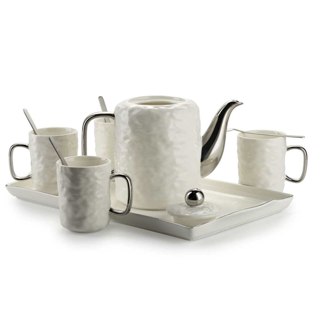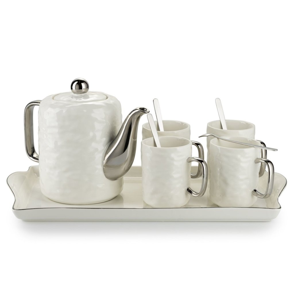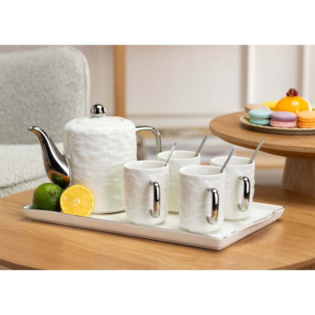 Stylová čajová/kávová souprava Selena Silver White. Set obsahuje hrníčky, džbán, čtyři zlaté lžičky a podnos. Šálky se vyznačují jemným reliéfním vzorem a jejich kovová ouška dodávají celku moderní charakter. Originálně tvarovaný džbán zajišťuje snadné nalévání nápoje a prostorný tác usnadňuje podávání. Set Selena je ideální volbou pro setkání, ale také pro každodenní použití. Bílá barva s jemnými chromovými akcenty se hodí do každého interiéru a jedinečný vzhled jistě upoutá pozornost.Doplňkové parametry
