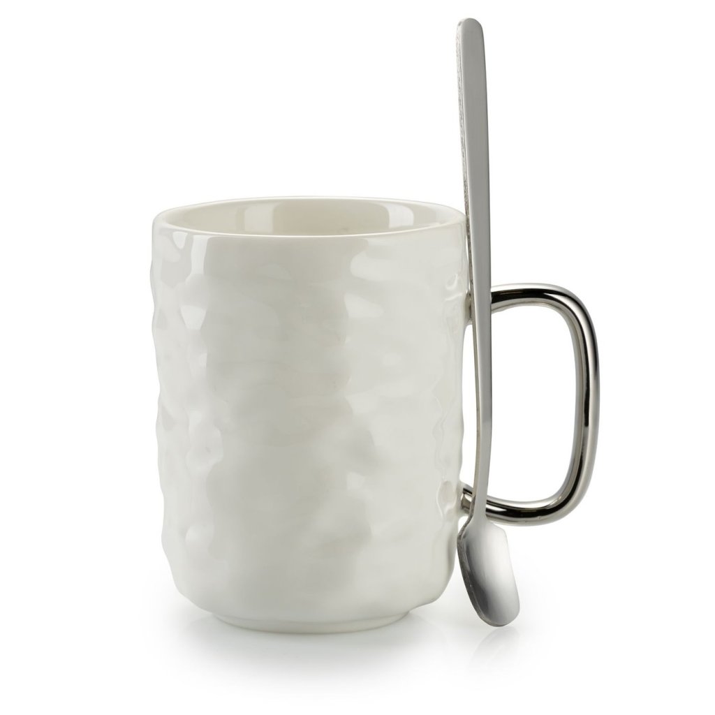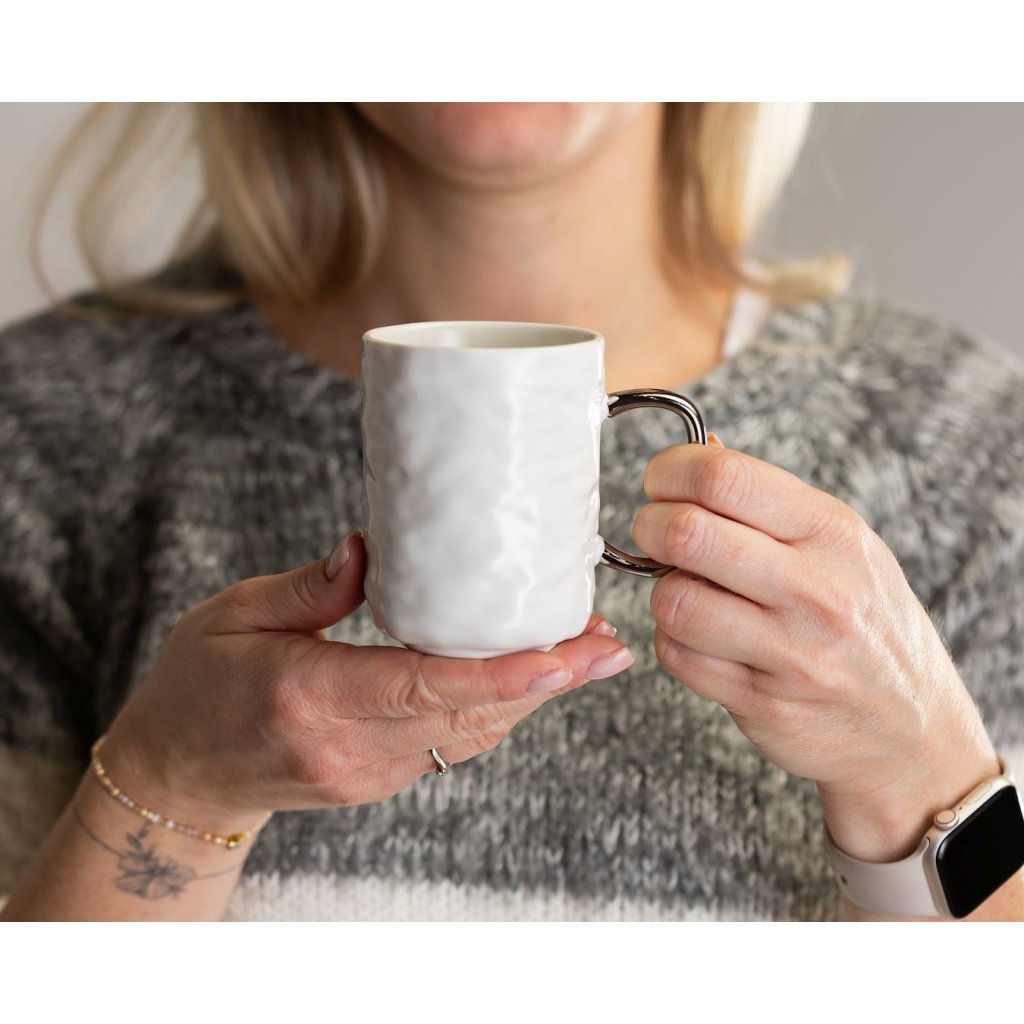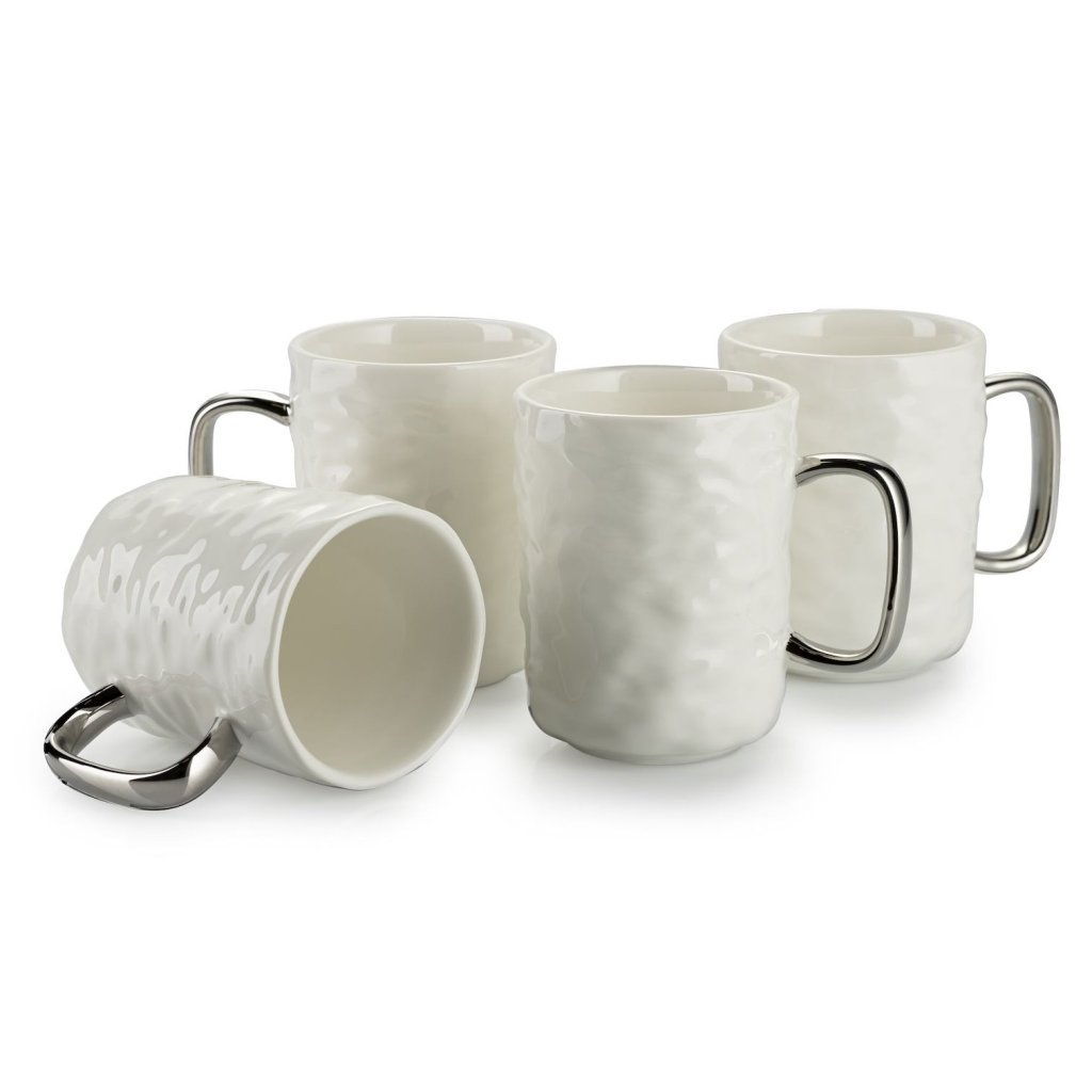 Stylová čajová/kávová souprava Selena Silver White. Set obsahuje hrníčky, džbán, čtyři zlaté lžičky a podnos. Šálky se vyznačují jemným reliéfním vzorem a jejich kovová ouška dodávají celku moderní charakter. Originálně tvarovaný džbán zajišťuje snadné nalévání nápoje a prostorný tác usnadňuje podávání. Set Selena je ideální volbou pro setkání, ale také pro každodenní použití. Bílá barva s jemnými chromovými akcenty se hodí do každého interiéru a jedinečný vzhled jistě upoutá pozornost.Doplňkové parametry