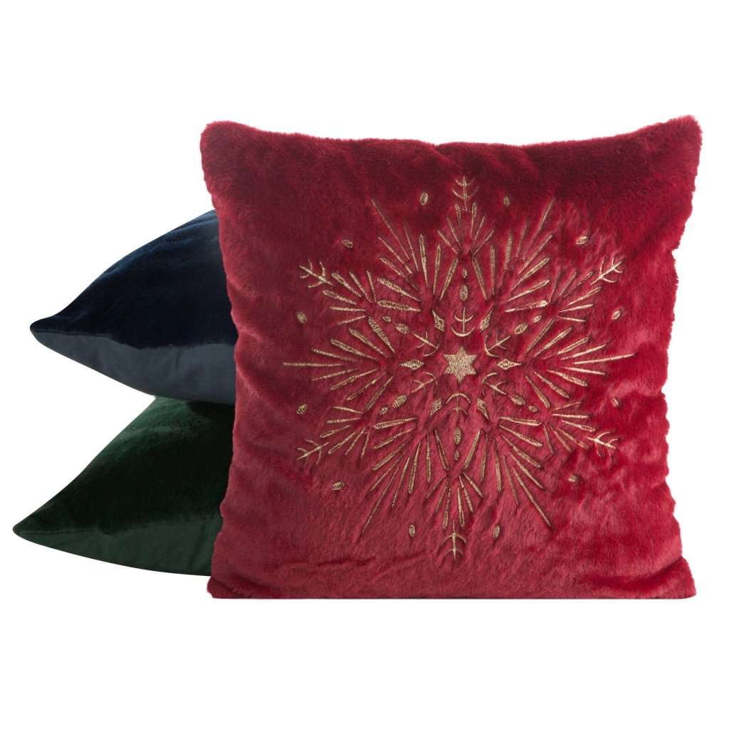 Přidejte svému interiéru útulný vánoční nádech s tímto dekoračním povlakem na polštář ze 100% polyesteru. Měkký plyšový povrch v bordó působí hřejivě a elegantně, zatímco zlatý vyšívaný motiv sněhových vloček vnáší do prostoru sváteční kouzlo. Díky skrytému zipu je přehoz praktický a snadno se udržuje.