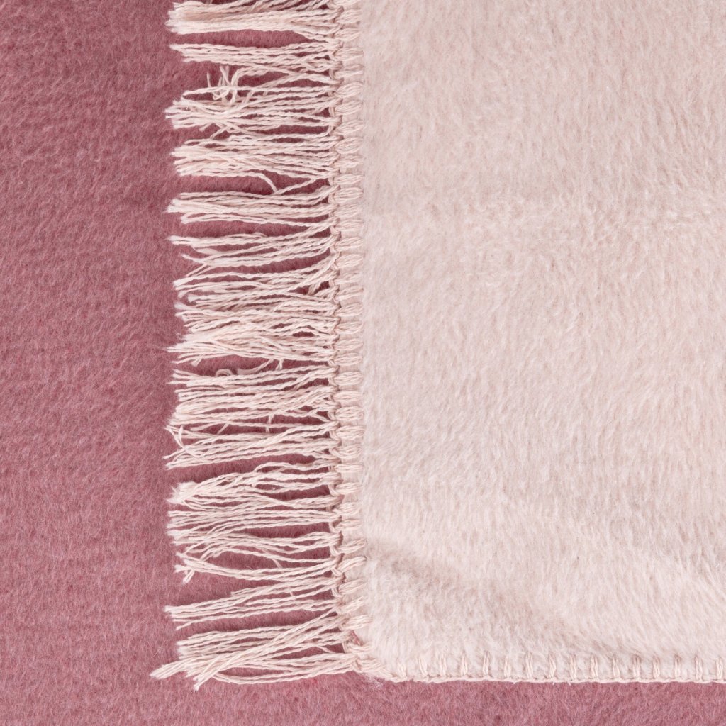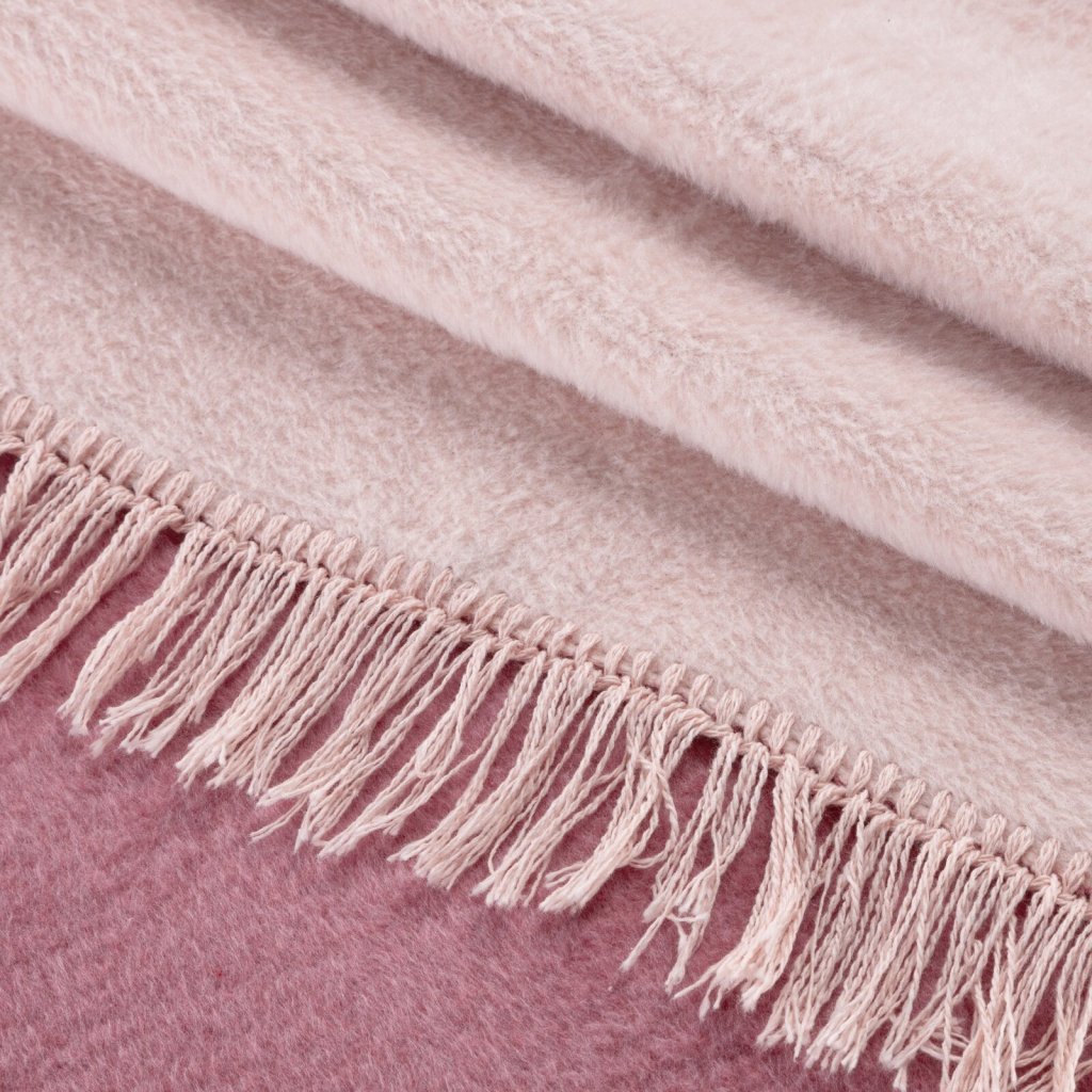 Dvoubarevná akrylová deka se střapci. Šířka: 220 cm, délka: 240 cm, barva: růžová, hmotnost: 450 GSM, složení: 58 % bavlna, 32 % akryl, 10 % polyester.Doplňkové parametry