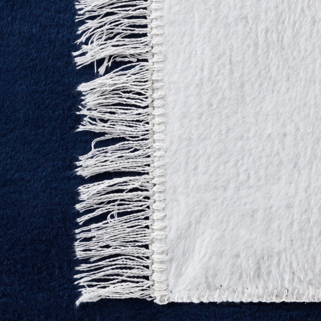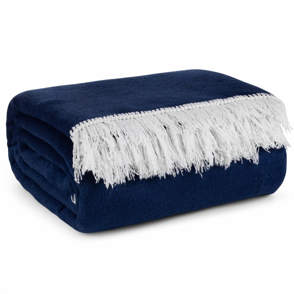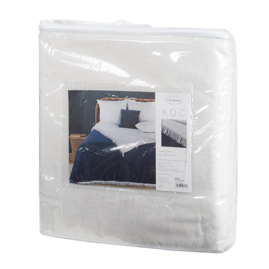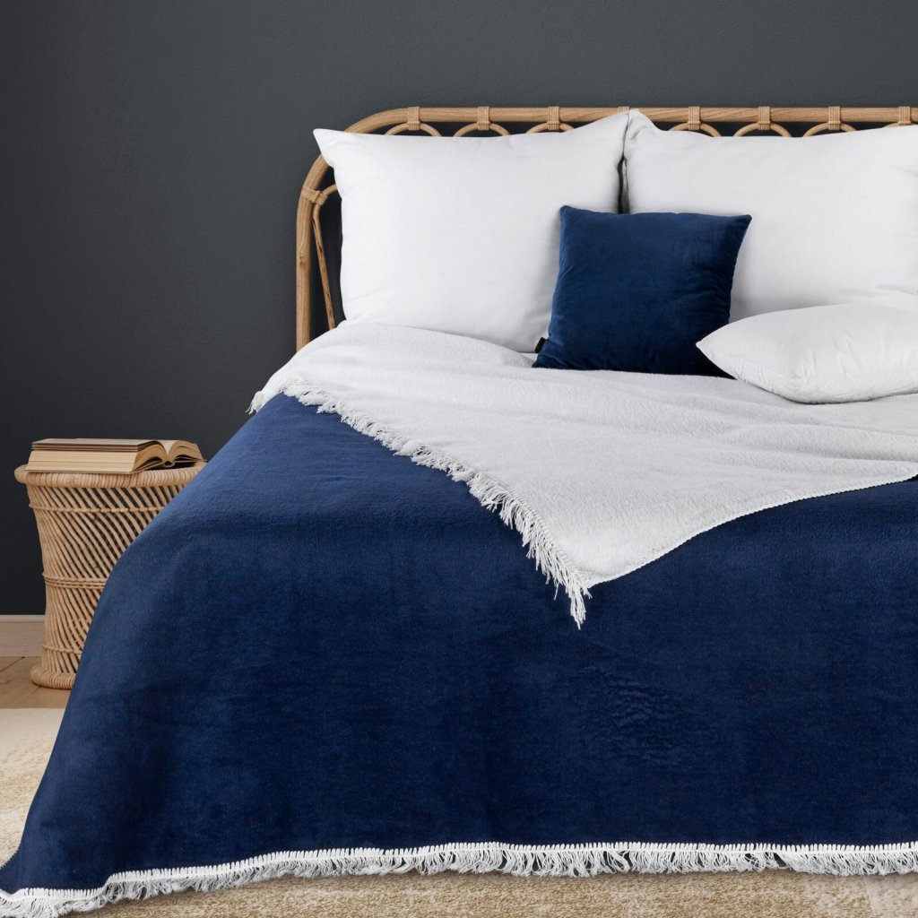 Dvoubarevná akrylová deka se střapci. Šířka: 220 cm, délka: 240 cm, barva: modrá a bílá, hmotnost: 450 GSM, složení: 58 % bavlna, 32 % akryl, 10 % polyester.Doplňkové parametry