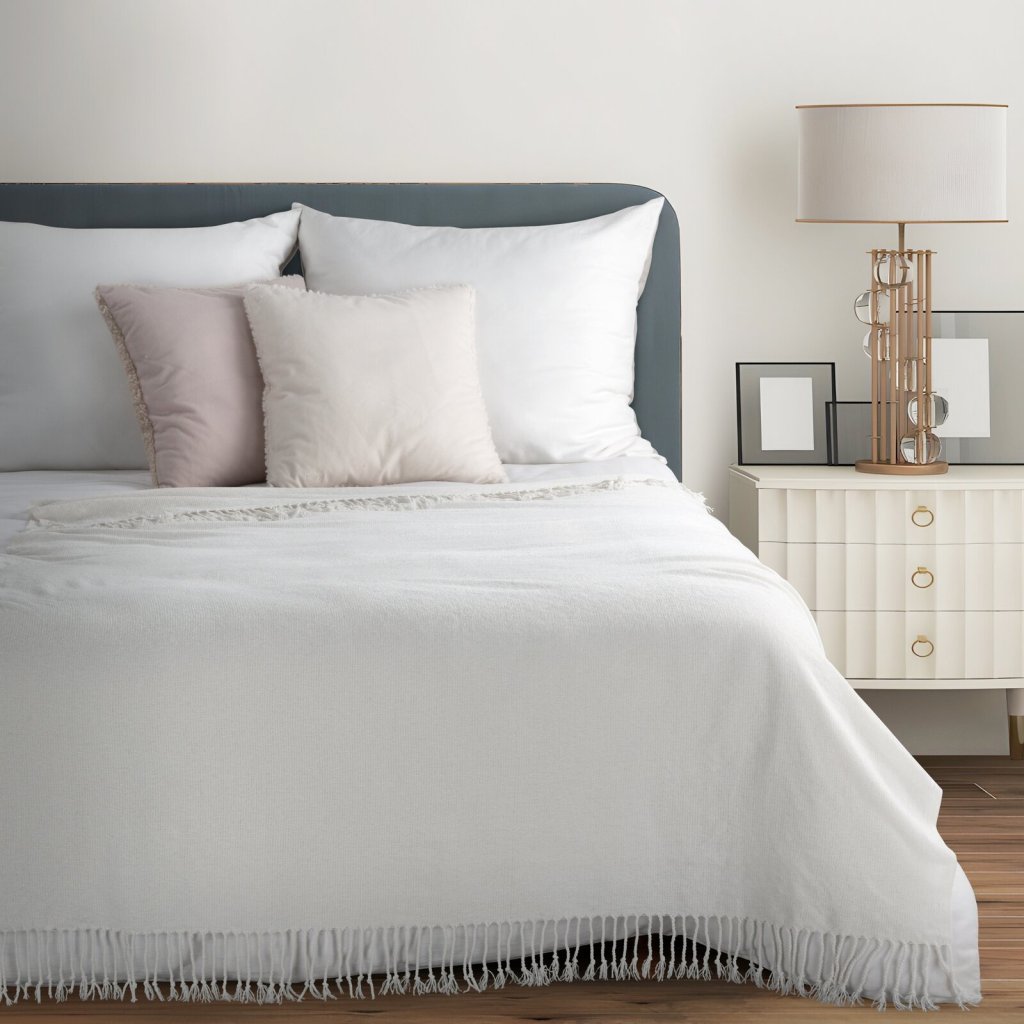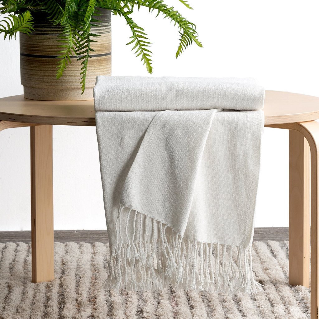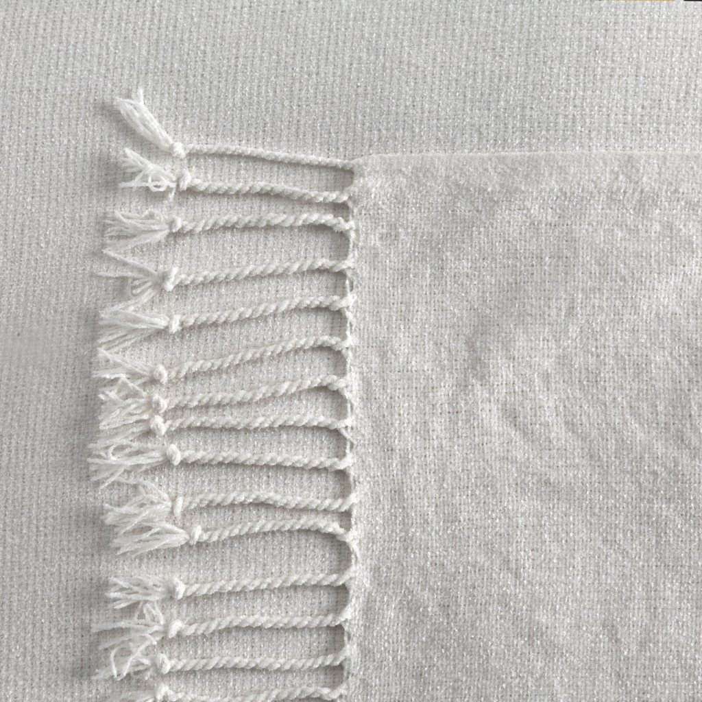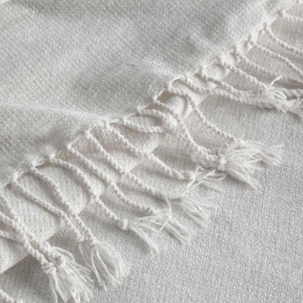 Tkaná deka se střapci, šířka: 130 cm, délka: 170 cm, barva: bílá, hmotnost: 220 GSM, složení: 100% polyester.Doplňkové parametry