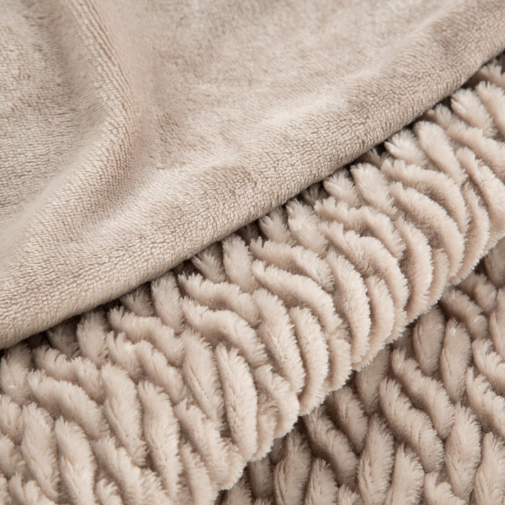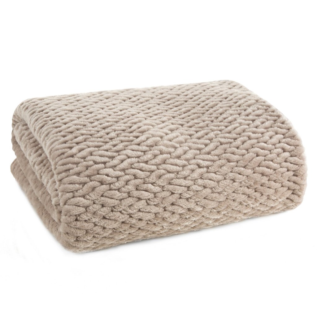 Jemná deka s copánkovým vzorem na jedné straně, fleecová deka na druhé straně. Šířka: 130 cm, délka: 160 cm, barva: béžová, hmotnost: 180 GSM, složení: 100% polyester.Doplňkové parametry