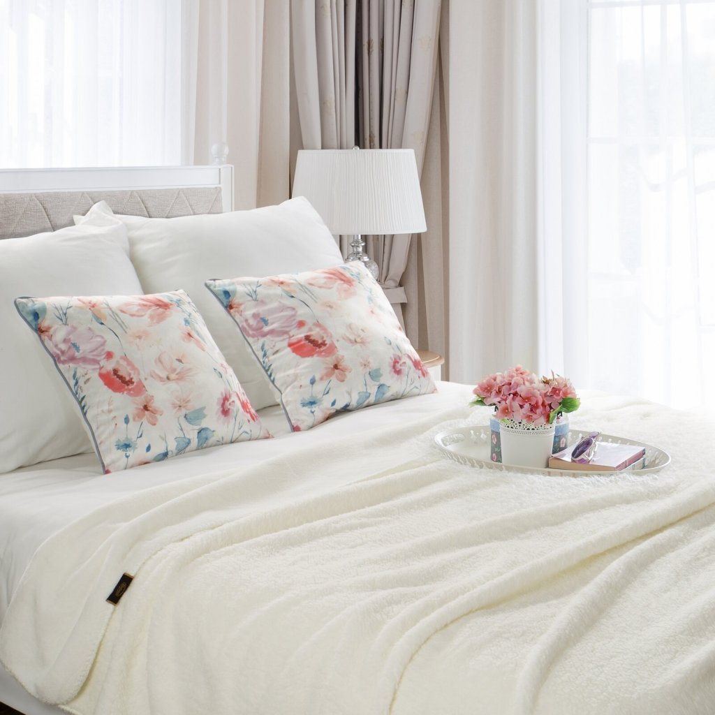 Pohodlná jednobarevná deka s jednou stranou z tkaniny bouclé, šířka: 170 cm, délka: 210 cm, barva: bílá, hmotnost: 340 GSM, složení: 100% polyester.Doplňkové parametry