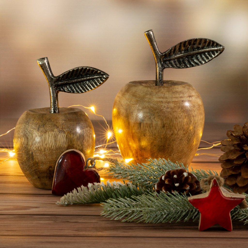 Dřevěná vánoční figurka zobrazující jablko zdobené stříbrným listem. Tato jemná figurka je vyrobena z přírodního dřeva. Šířka: 8 cm, délka: 14 cm, barva: hnědá a stříbrná, složení: 90 % dřevo, 10 % hliník.Doplňkové parametry