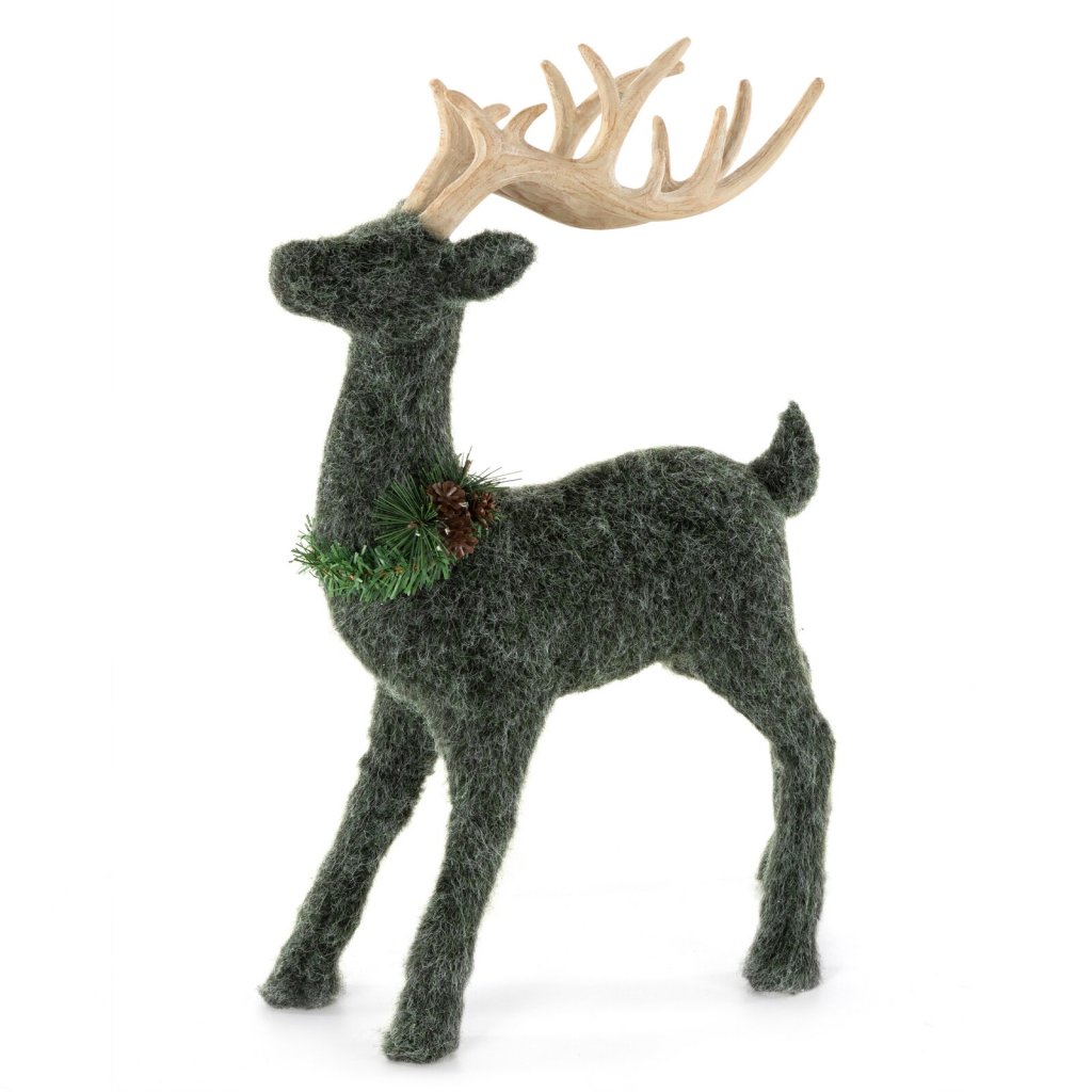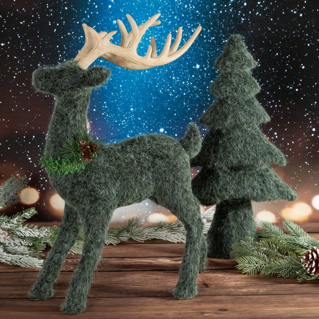 Dekorativní figurka ve tvaru soba. Měkká plstěná tkanina, kterou je sob potažen, dodává dekoraci útulný charakter a dodává jí jemnou strukturu a hřejivý, přírodní vzhled. Soba zdobí působivé velké parohy z přírodního dřeva. Šířka: 30 cm, délka: 47 cm, barva: tmavě zelená, složení: plast.Doplňkové parametry