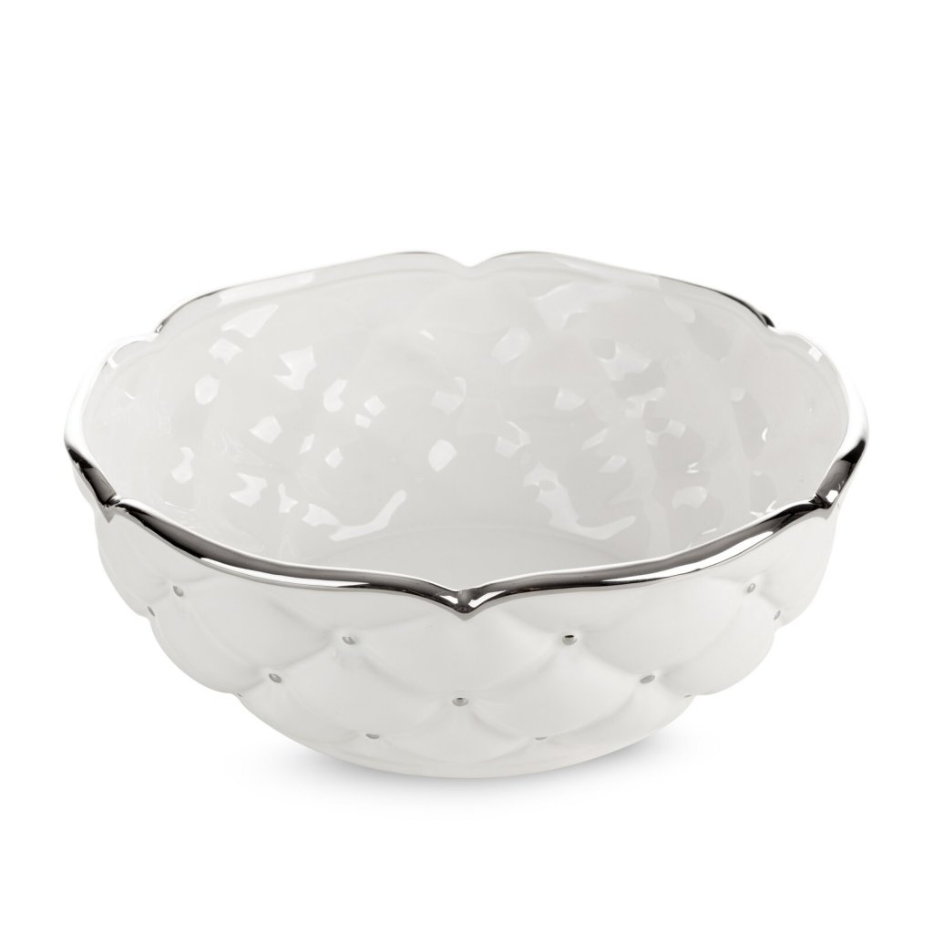 Elegantní a stylová keramická mísa, která kombinuje funkčnost a jedinečný design. Její povrch zdobí reliéfní vzor připomínající prošívání, který misce dodává luxusní charakter a působivou strukturu. Drobné stříbrné akcenty jemně odrážejí světlo a vytvářejí jedinečný dekorativní akcent. Šířka (průměr): 25 cm, délka: 10 cm, barva: bílá a stříbrná, složení: keramická hlína.Doplňkové parametry