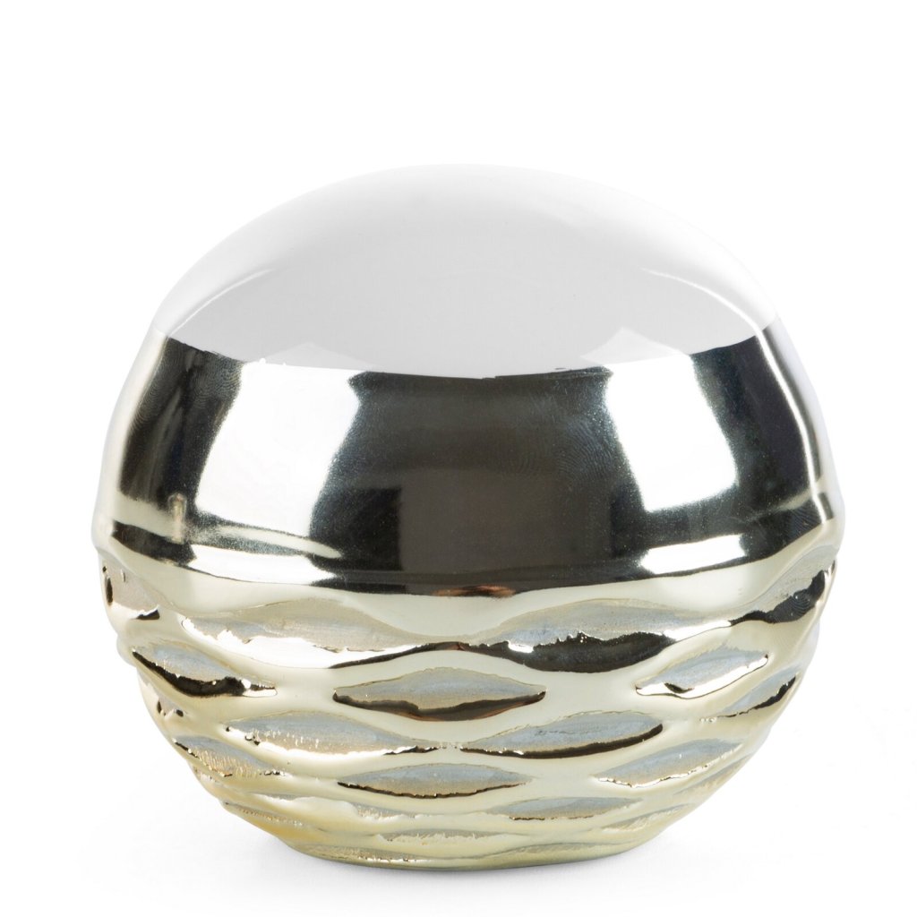 Elegantní dekorativní koule DOLY z vysoce kvalitní keramické hlíny. Spodní část je zdobena šampaňským, reliéfním vzorem, který jí dodává luxusní charakter a jemnou strukturu. Horní část zůstává hladká a lesklá, což vytváří efektní kombinaci kontrastních povrchů. Šířka (průměr): 9 cm, délka: 9 cm, bílá a šampaňská, složení: keramická hlína.Doplňkové parametry