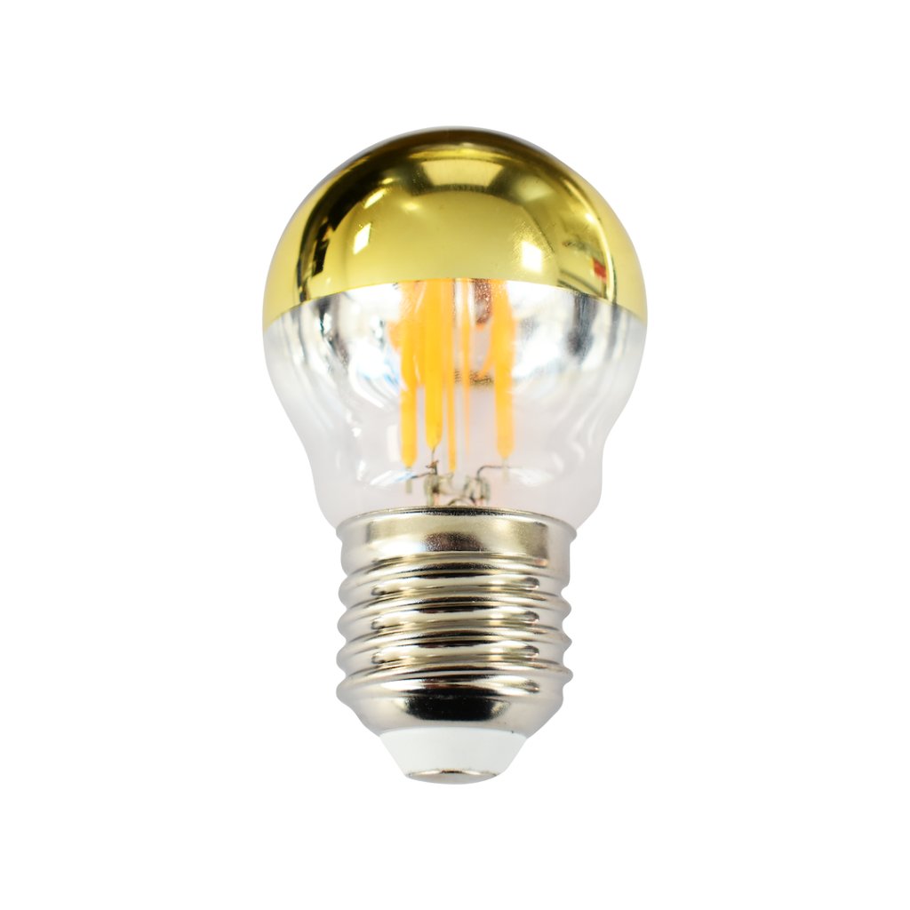 Dekorační LED žárovka E27 se zrcadlovou horní částí ve zlatém provedení má výkon 4 W a světelný tok 430 lm. Vyzařuje teplé bílé světlo s barevnou teplotou 2700 K a zároveň slouží jako výrazný vizuální prvek v interiéru.