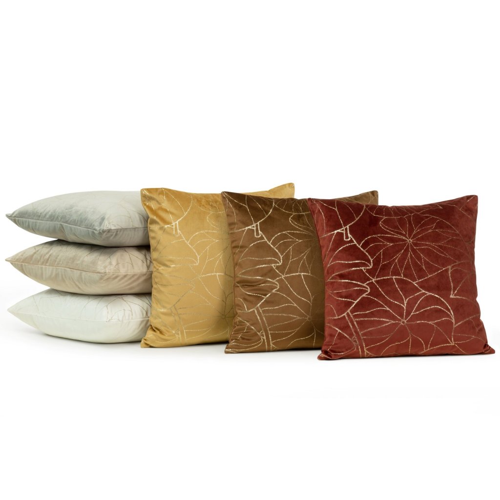Dekorační povlak na polštář zdobený potiskem. Šířka: 45 cm, délka: 45 cm, barva: cihlová/světle zlatá, hmotnost: 250 GSM, složení: 100% polyester.Doplňkové parametry